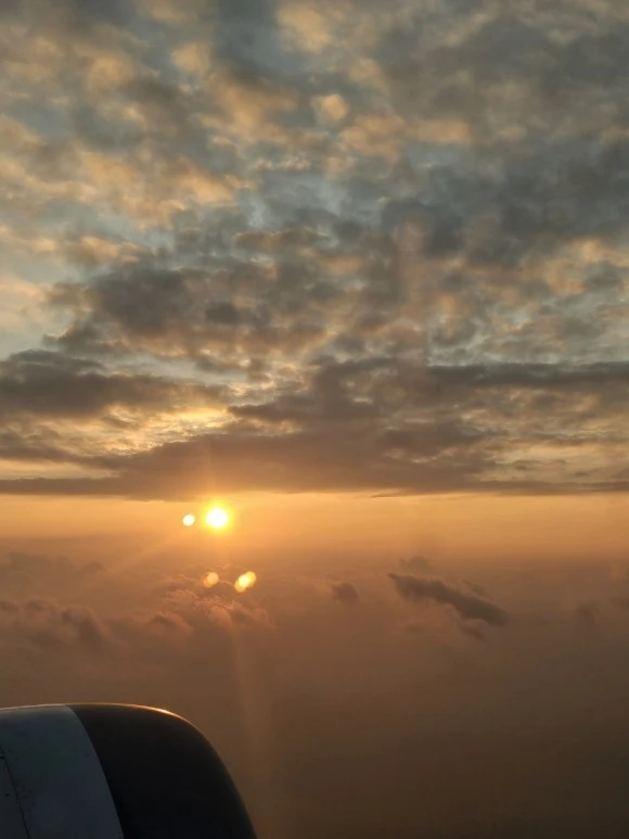 비행기 탑승은 정시에 이루어졌으나 활주로에서 10분 늦게 출발했다. 하늘에서 바라보는 석양은 비행기 날개를 황금빛으로 물들이며 점점이 떠있는 구름들을 환상의 세계로 만든다.