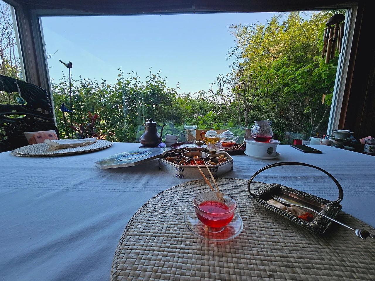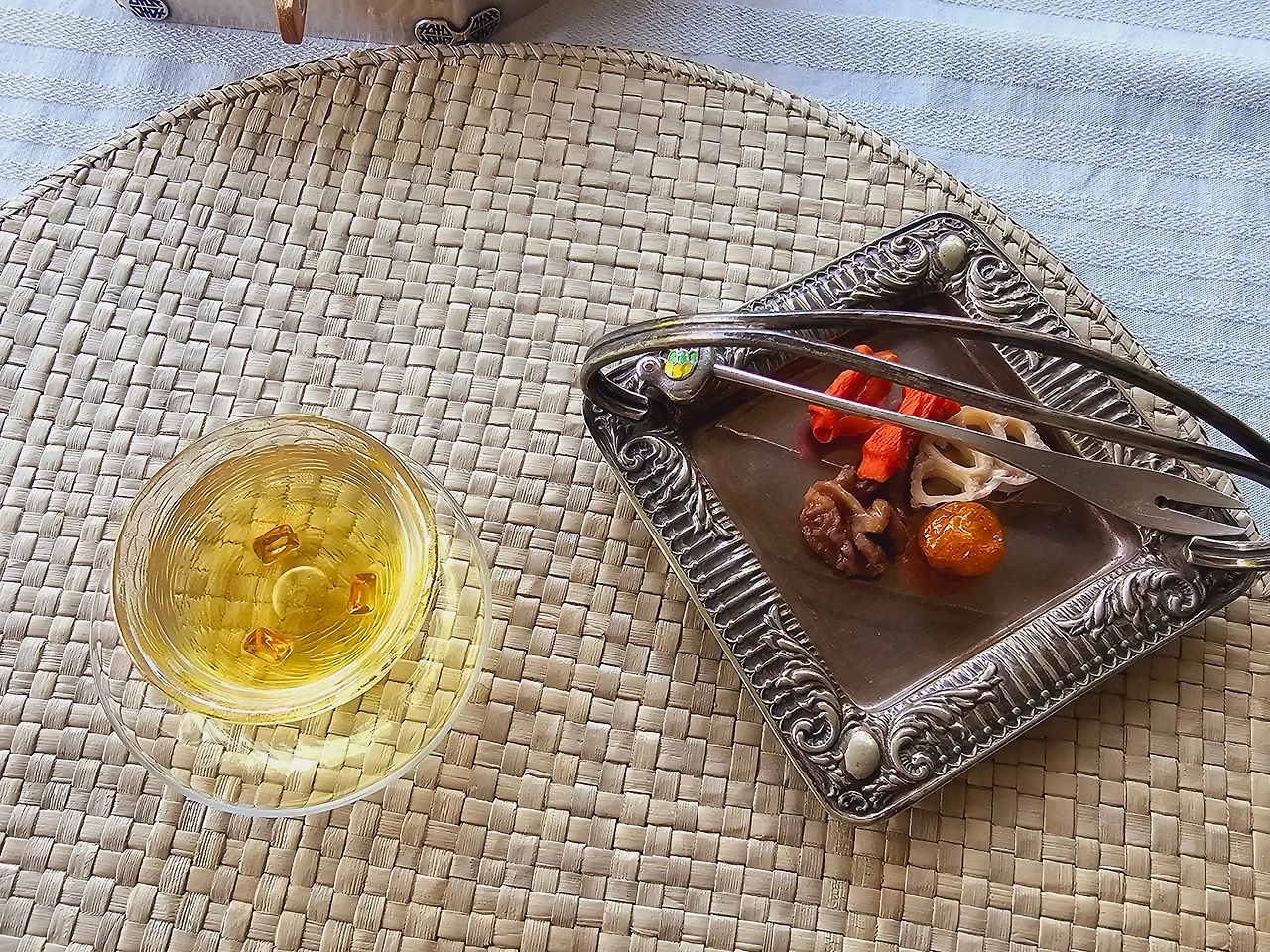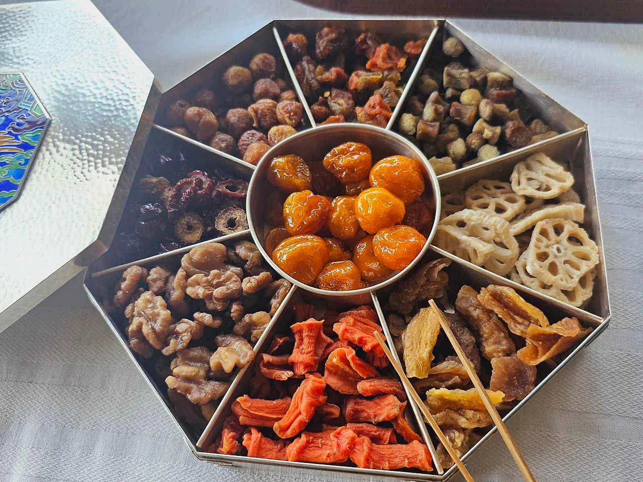 처음에 따라주는 진피차, 말린 귤껍질을 이용해 우려내 정성스럽게 내미는 조그만 유리잔이 더 향기롭다. 차와 더불어 온갖 견과류와 말린 과일들이 담긴 8첩 반상기가 인상적이다. 차를 마시며 안주를 먹는 기쁨을 처음으로 느낀다. 특히 가운데 놓인 금귤을 조려낸 과일과 연근을 말린 것이 맛이 있었으며 이름 모를 다른 말린 과일도 맛이 있었다.