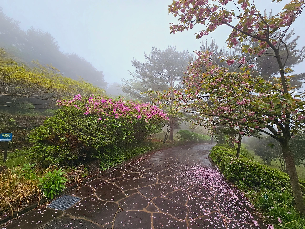 처음 서귀포에 숙소를 정하고 5일을 보내며 한라산을 가로지르는 중산간 도로를 지나던 때를 잊을 수 없다. 근래에 제주 올 때마다 불편을 느끼는 것이 날씨이다. 청명한 파란 하늘을 거의 본 적이 없다. 흐리고 구름 낀 날씨가 계속되고 중산간 도로는 짙은 안개로 오전은 물론 오후에도 앞 차를 분간할 수 없을 정도여서 힘든 운전을 3번이나 해야 했다. 이 도로는 다시 오고 싶지 않아를 외치며 다녔다.