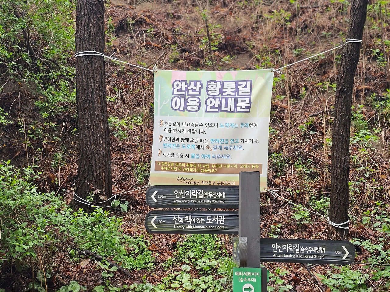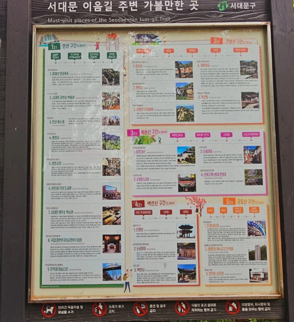 서대문 주변의 볼거리들도 안내판에 잘 게시되어 있어서 다양하게 둘레길을 걸을 수있는 서대문 이음길, 즉 안산, 인왕산. 북한산. 백련산 그리고 궁동산의 5코스로 연결되는 생태순환길이 푸르른 자연과 더불어 펼쳐져있다. 마치 외곽에 나온 것처럼 꽃의 향기와 초록의 향연이 펼쳐진한적하고 조용한 길을 산책할 수 있는 좋은 도심 속 힐링 명소로 추천하고 싶다.