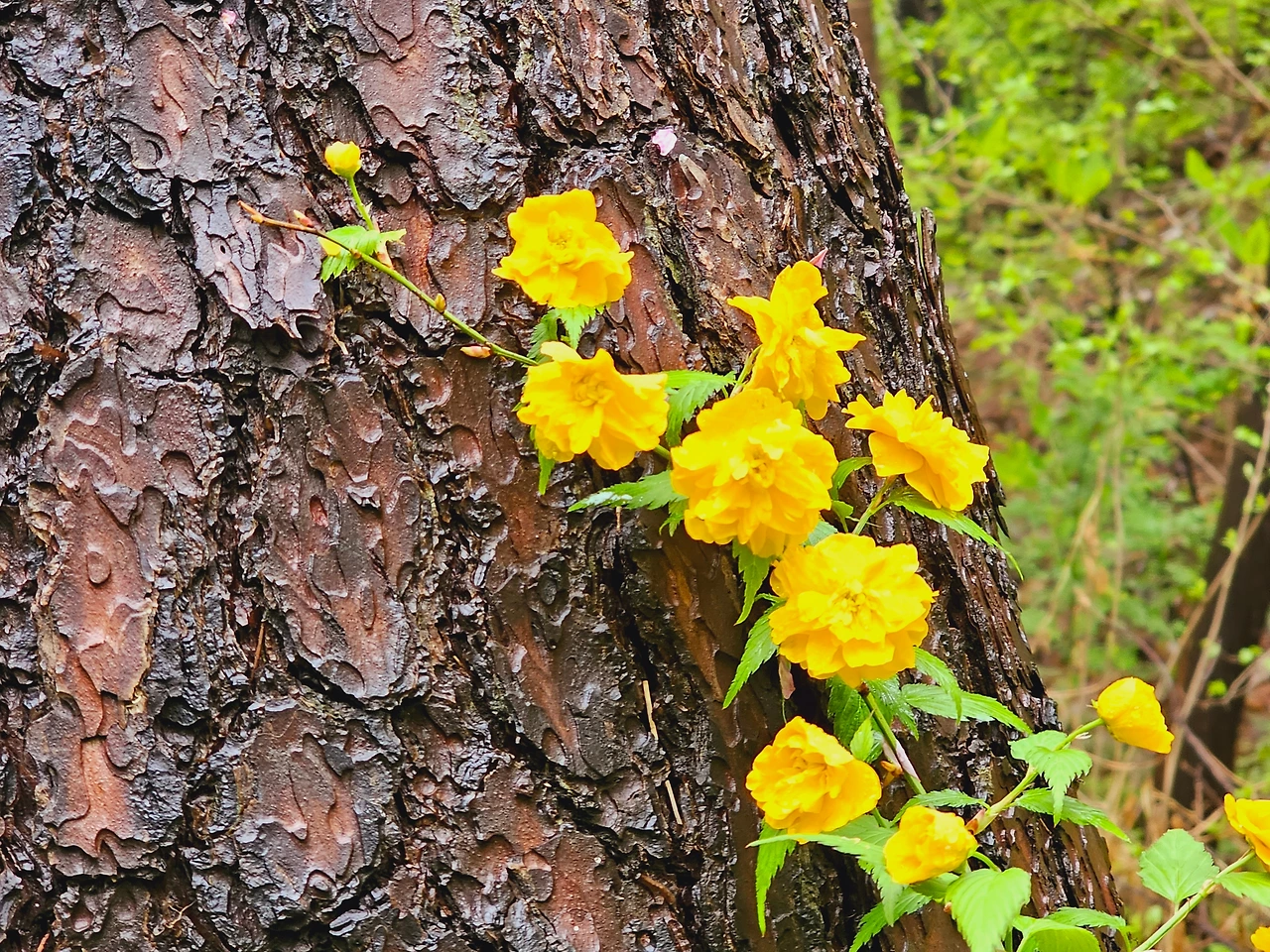 꽃들과 작별의 아쉬움을 뒤로하고 안산자락 둘레길을 가기 위해 데크길을 따라가면 양 옆으로 피어있는 황매화 꽃을 볼 수 있다. 초록색의 나뭇잎과 대조적으로 노란 황매화는 노랑꽃의 자태를 뽐내고 있으며 싱그럽기만 하다.