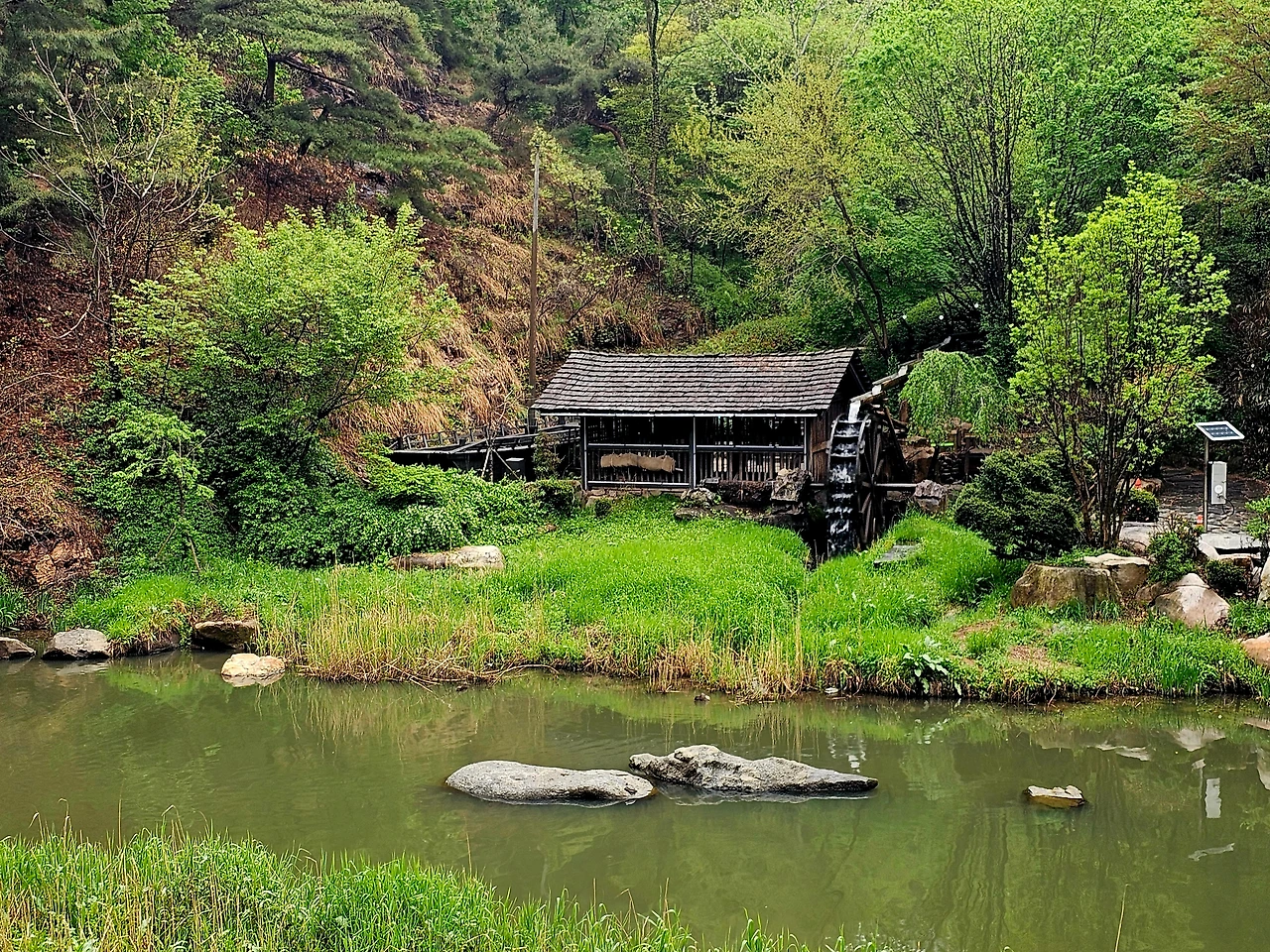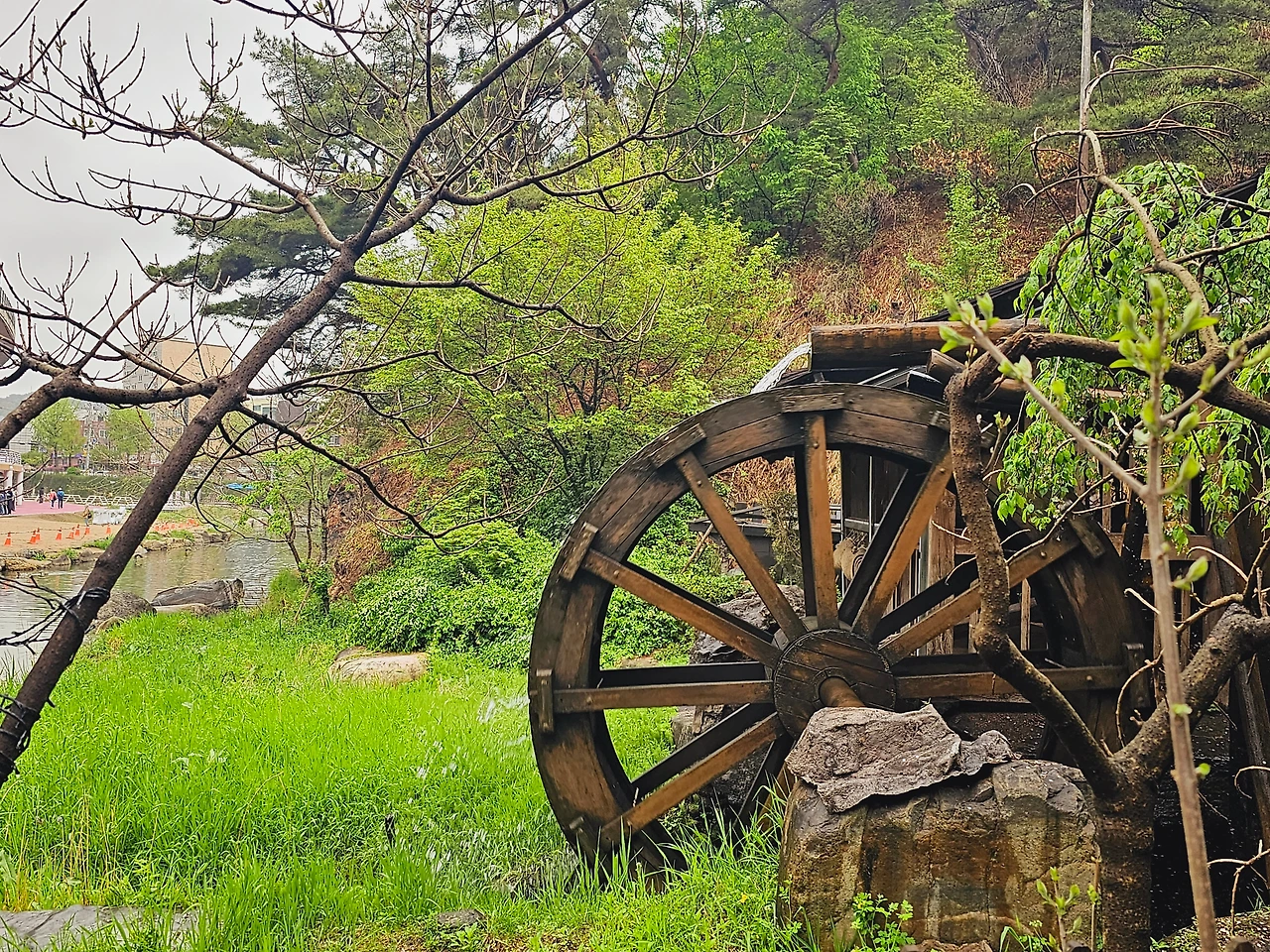 잠시 폭포에 더운 열기를 식히고 연희 숲 속 쉼터와 안산 자락길의 안내판을 따라 개울을 건넌다. 징검다리를 하나 둘 건너면 쉴 새 없이 돌아가는 물레방아를 볼 수 있다. 이 물레방아는 강원도 정선군에서 100여 년 전부터 현재까지 사용하고 있는 전통 물레방아를 재현한 것으로, 보는 것만으로도 과거로 돌아가 시골길을 걷는 것 같은 여유로움과 숨을 고르게 하는 곳이다.