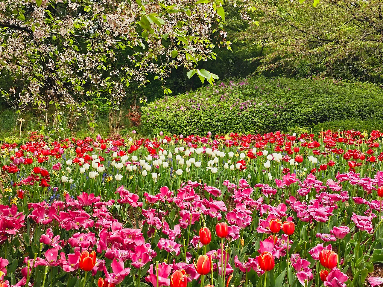 데크길을 따라 조금 더 오르면 도시 한가운데라는 것을 잊게 만드는 허브원의 꽃동산이 펼쳐진다. 도심에서 벗어난 허브원의 정원은 4월에 활짝 핀 벚꽃으로 장관을 이루고 바람에 꽃비를 날리며 흩어지고 있으며, 벚꽃 아래는 색색깔의 튤립과 철쭉, 수선화등 다양한 꽃들의 잔치를 보개 된다. 둥근 원의 형태로 꽃들이 둘러 쌓인 꽃들 앞에서 소풍 나온 유치원생들의 사진 찍는 아이모습이 꽃보다 더 사랑스럽다. 4월의 봄을 만끽하기 위해 나온 사람들은 꽃비를 맞으며 꽃들의 향기에 흠뻑 젖어본다.