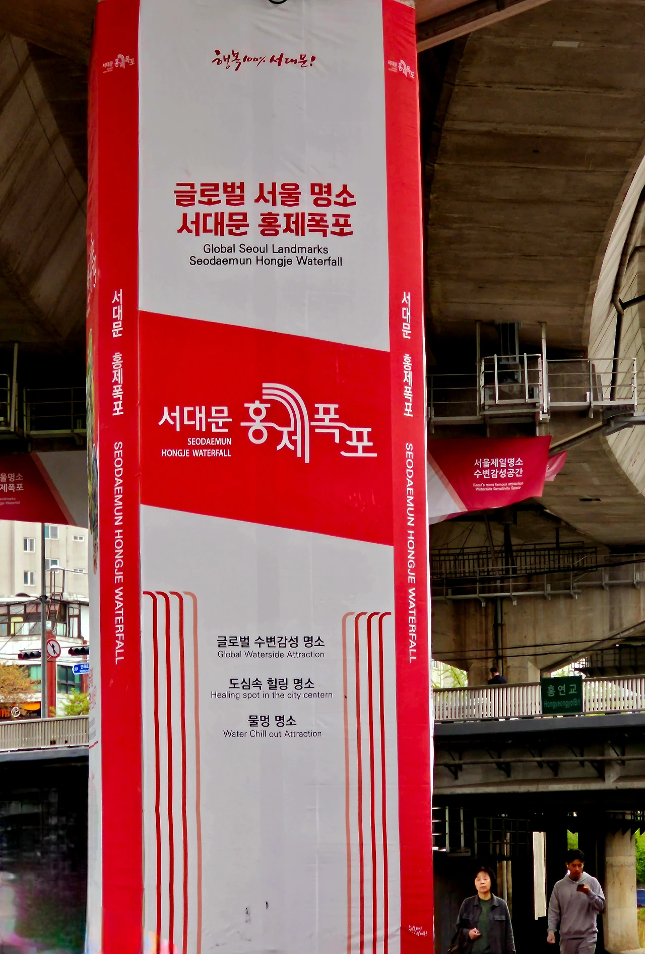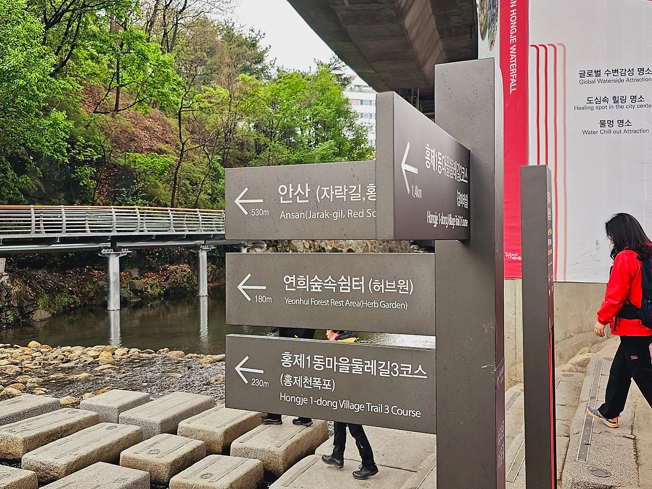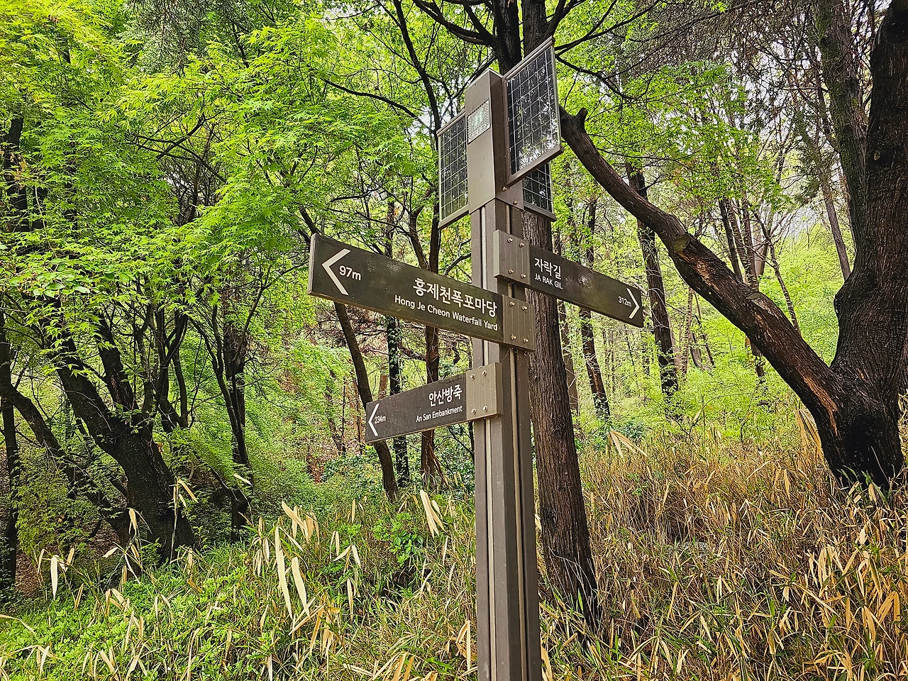 도심 속에서 숲길을 걷는다는 것은 정서적 안정과 마음의 여유로움을 준다. 특히 홍제 인공폭포와 안산공원 둘레길은 아름다운 경관과 더불어 편안하게 산책할 수 있는 대표적인 곳으로 소개하고 싶다. 홍제역 3번 출구로 나와 서대문 01번 마을버스를 타고 서대문구보건소 별관에 내리면 홍제 인공폭포에 올 수 있다. 또는 홍제역에서 나와 홍제천을 따라 걸으면 홍제 인공폭포에 도착할 수 있다. 홍제천은 북한산에서 발원하여 종로구, 서대문구, 마포구를 흐르다가 한강의 하류로 흘러드는 하천으로 시민들이 여유 있게 걸어 다닐 수 있도록 곳곳을 잘 정비해 놓아서 여유를 가지고 걸어가도 좋다.