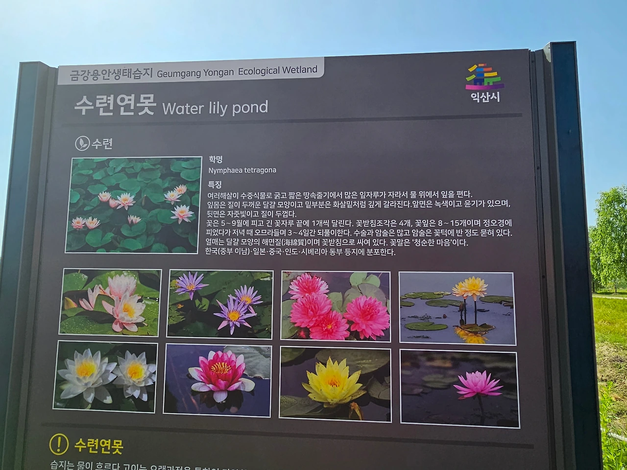 잘 조성된 수련은 아직 이른 철인지 연꽃이 많이 피지는 않았지만 7월에는 수련밭으로 군락을 이루어 장관일 것 같았다. 다양한 종류의 수련이 심어져 있다고 귀띔해 준다. 이곳에 다시 방문하여 연꽃을 보리라 생각한다. 가을에는 최대규모의 억새단지가 있어서 금강억새축제가 열린다고 한다.