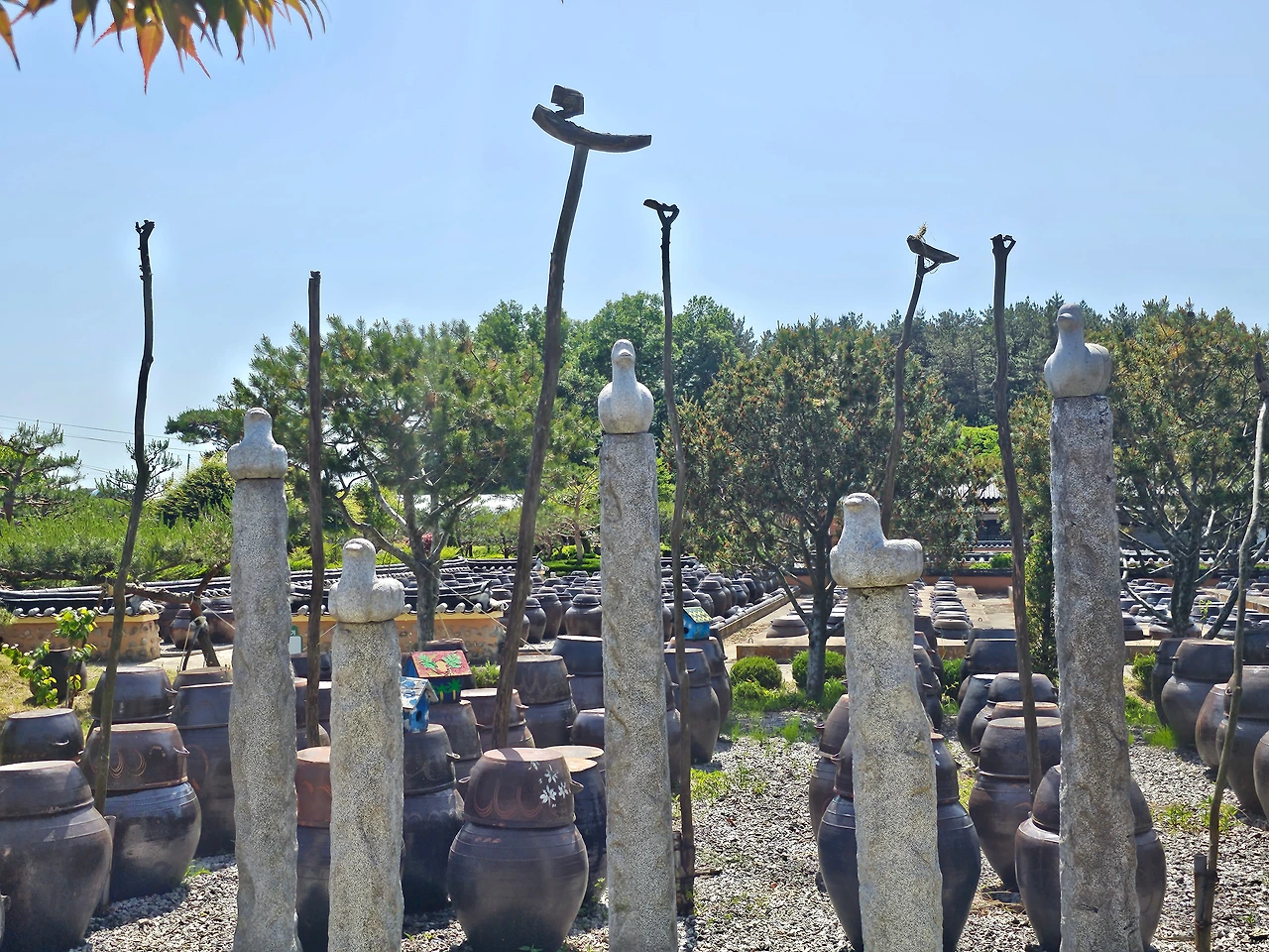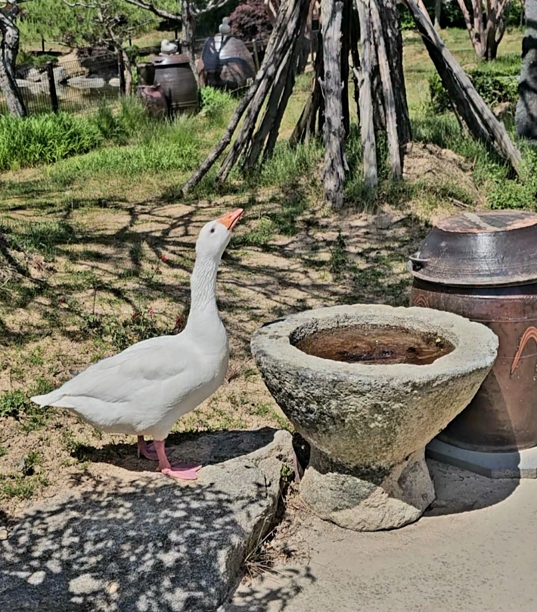 장독대 사이로 솟대 위에 앉은 오리 가 정겹게 보인다. 실제로 연못에 오리가 한가롭게 물을 마시며 놀고 있는 모습도 눈에 띈다.