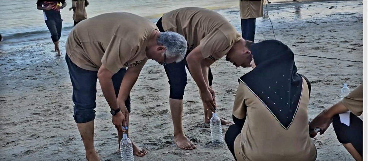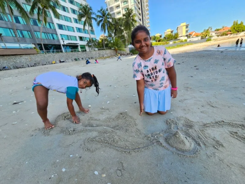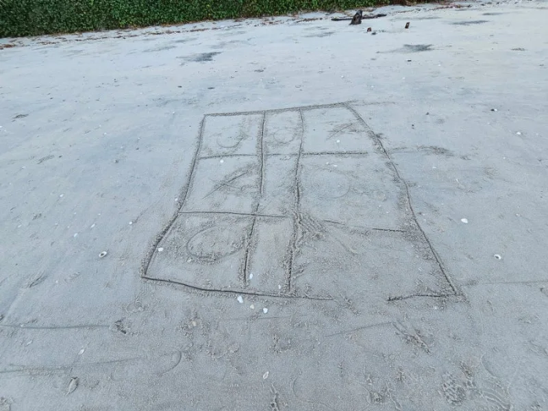 해변을 내려와 보니 벌써 아이들도 나와서 모래 위에 그들의 영역을 표시하며 그들만의 세상을 만들고 있다. 지구상의 어린아이들 생각은 비슷한지 조개로 장식한 모래집과 놀이를 연상케 하는 그림을 그려놓아 저절로 동심의 세계로 들어간다.