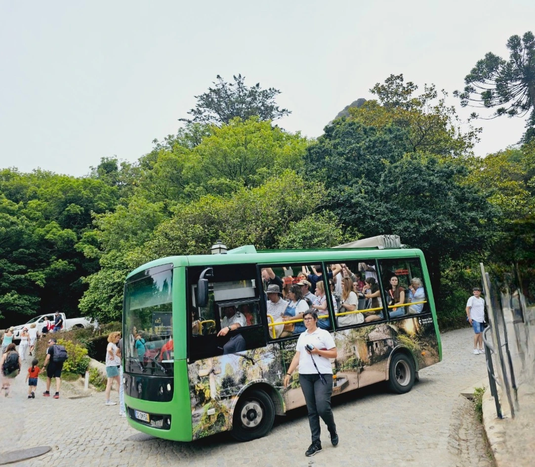 입구에 내려 다시 성으로 올라가는 초록색 미니 버스를 기다린다. 관광객이 너무 많아 일부는 숲길을 걸어 올라가기도 하고 우리는 미니 버스 대기를 하다가 간신히 승차하여 성 앞에서 내렸다.