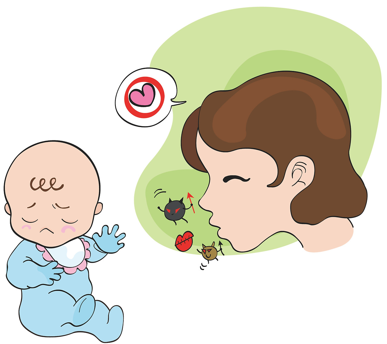 충치를 일으키는 대표적인 원인균인 뮤탄스균(S.mutans)은 입 안에서 입 안으로 옮겨갑니다. 충치는 감염성 질환인데 그 원인이 되는 뮤탄스균을 제공하는 것이 가족 간 접촉을 통해서라고 합니다. 이가 처음 나서 자리를 잡는 1.5~2.5세 사이에 뽀뽀로 옮겨간다는 것이지요.