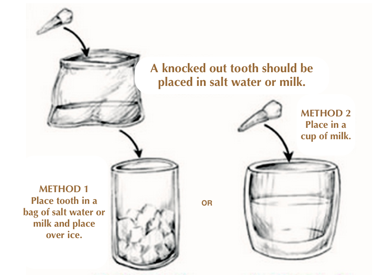 빨리 치과에 가는 것이 가장 중요하긴 하지만 치아를 병원까지 어떻게 보관하느냐 하는 것도 그에 못지않게 중요합니다. 치아의 뿌리 부분의 표면에는 치아를 살릴 수 있는 중요한 조직세포들이 붙어있습니다. 따라서 이물질이 묻었다고 해서 문질러서 닦게 되면 세포들이 모두 손상되게 됩니다. 표면이 건조되어 마르는 것도 막아야 합니다. 따라서 이물질을 굳이 제거하려고 하지 말고 치아의 머리 부분을 잡고 흐르는 물에 가볍게 씻어주는 정도만 하고 냉장 보관된 식염수나 우유에 빨리 담가서 가져가는 것이 좋습니다. 우유의 영양성분이 조직세포의 유지에 도움을 주기 때문에 비교적 주변에서 쉽게 구매할 수 있는 우유가 현실적으로는 가장 좋습니다. 아무것도 구할 수 없는 상황이라면 혓바닥 밑에 넣어서 이동할 수도 있지만 이 방법은 수돗물에 담가오는 것과 함께 그리 추천되는 방법은 아닙니다.