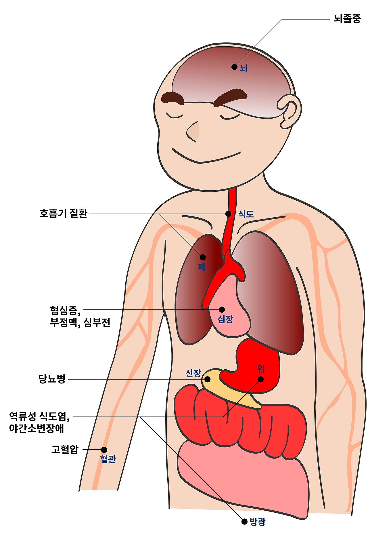 수면무호흡증이 위험한 것은 그 자체의 문제뿐 아니라 다른 질병과 연관되기 때문이기도 합니다. 미국에서만 연간 3000~4000명이 수면무호흡증과 연관되어 사망하는 것으로 보고되고 있습니다. 무호흡 시간이 길어지면 심장 박동이 빨라지고 산고 공급도 줄어들게 됩니다. 심장 박동이 빨라지고 산소 결핍 증세가 생기면 심장은 몸에 산소를 공급하기 위해 더욱 무리하게 됩니다. 이로 인해 심장 질환과 고혈압, 부정맥으로 이어질 수 있습니다. 수면무호흡증이 있는 사람은 심장질환으로 사망할 확률이 일반인에 비해 30%나 높습니다. 혈액순환의 문제, 발기부전 등도 코골이와 수면무호흡증을 치료해 좋아지는 경우가 많습니다.