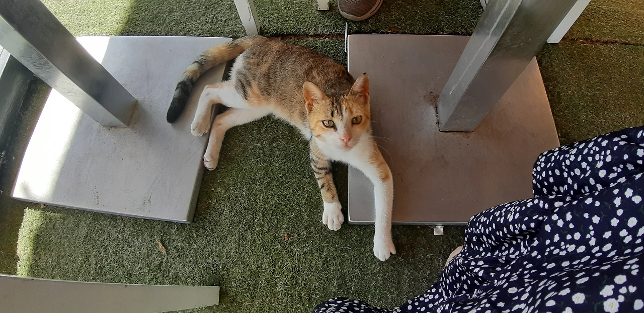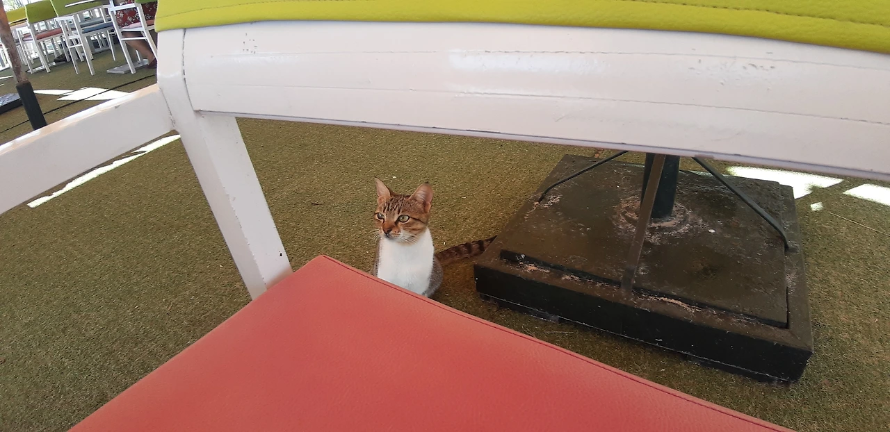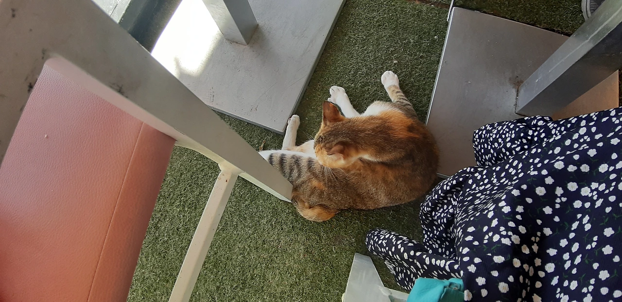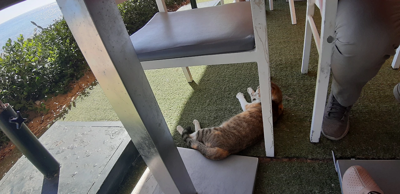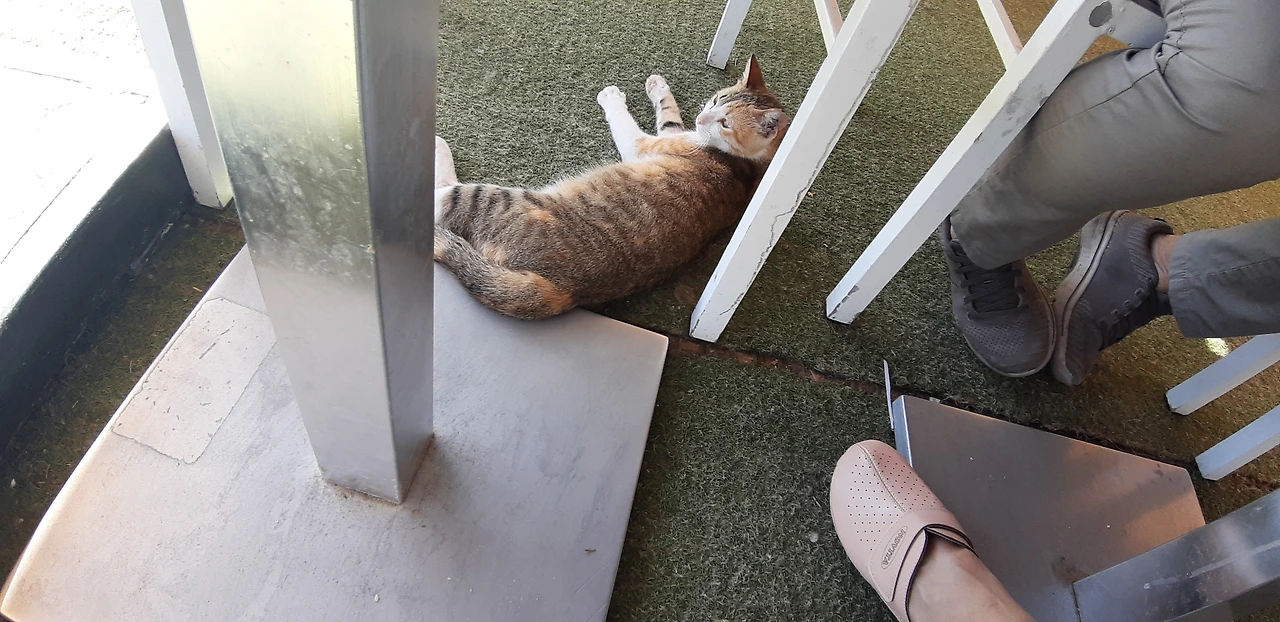 # 끝으로 식당 안에서 내가 조금 떼어준 쇠고기 살로메 먹고 낮잠 잔 고양이 사진들을 보낸다.여긴 문화가 고양이들에게 우호적이고 고양이들도 예쁘고 사람들과 친근하게 행동한다(인심 좋은 손님들은 살로메 한 장을 툭 던져주서 그런지...)다음에 와도 또 고양이들과 놀고 싶다. 고양이들처럼 아무생각없이 편하게 늘어져 자고 싶은 하마 메드 해변 햇빛이다 ㅎㅎㅎ.