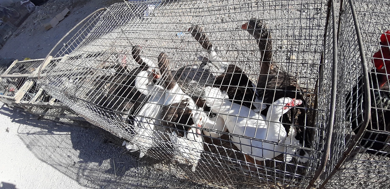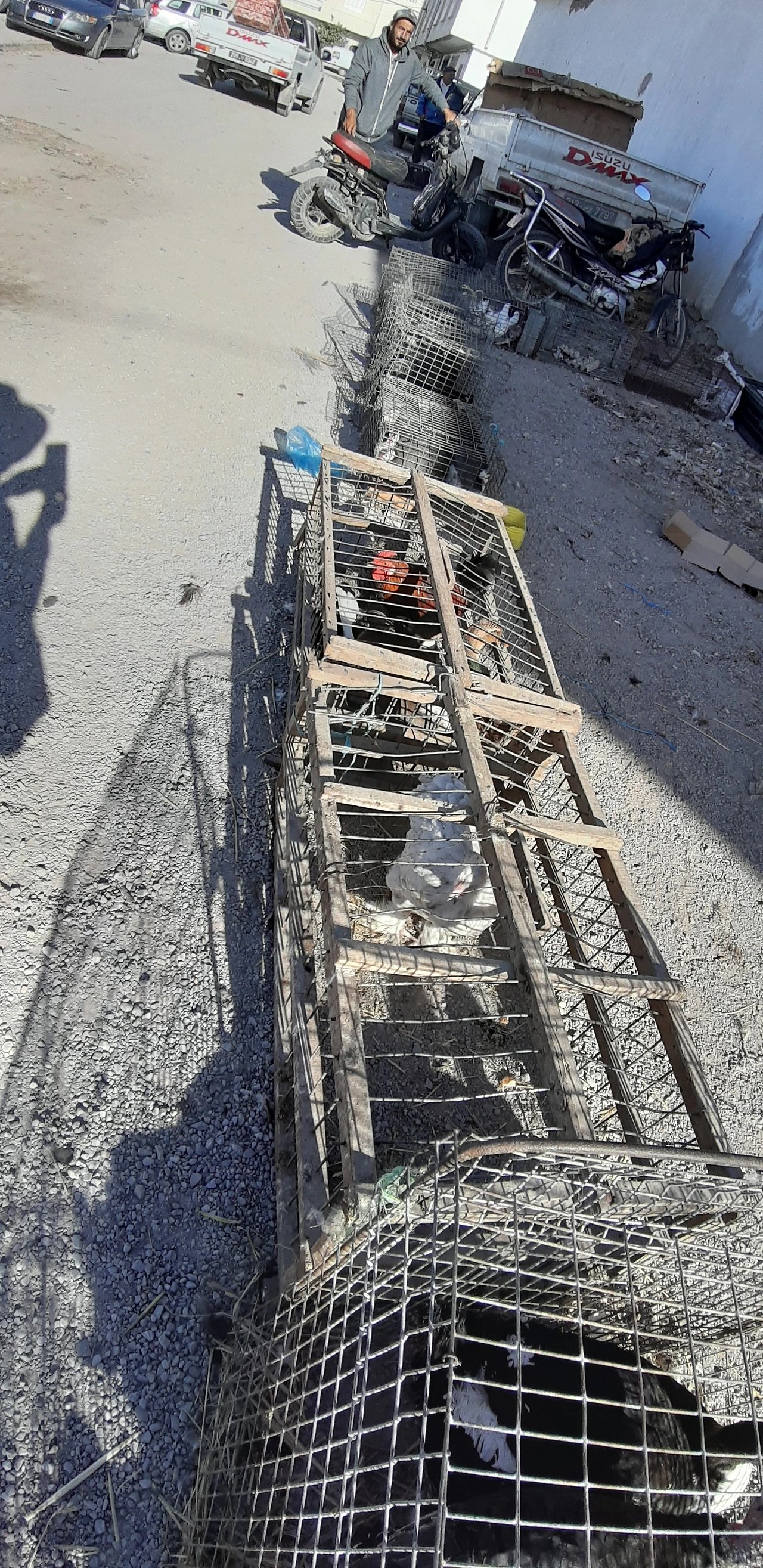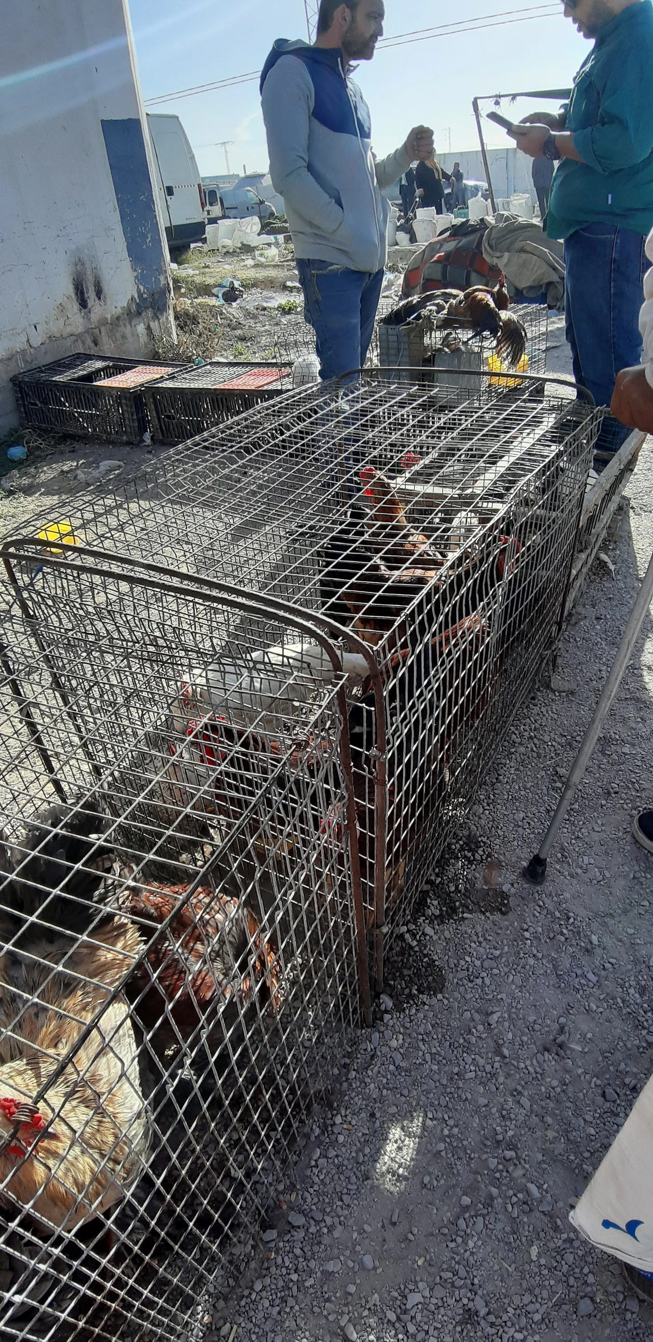 상인에게 팔린 닭들은 산 채로 다리들이 묶여 남자들 손에 의해 거꾸로 들려진 상태로 시장 군중 사이로 사라지고 있었다. 대식구를 가진 사람들처럼 보였다. 행복한 얼굴들이었다. 가족 행사가 있는지 아님 흥정을 잘해 기분이 좋았는지 그들의 언어로 말하고 웃으며 산 닭들을 들고 갔다. 두 명이 여러 마리 큰 닭들을 들고 갔다. 닭들은 거꾸로 묶여 가면서 "꼬꼬꼬... 꼬끼오... 꼬꼬 " 울었다. 닭들은 움직였다. 하지만 남자들은 많이 했을 것 같은 경험자들처럼 능숙하게 손으로 들고 가벼운 발걸음으로 내 시야에서 사라졌다. 어쩜 닭들의 울음은 그 두 명의 튀니스 두 남자들에겐 파티 전 신나는 서곡처럼 들렸을 것 같다. 음식을 요리할 가족 여자들의 주방 수다를 상상하며, 닭요리를 나눌가족의 식탁의 재밌는 대화 시간을 기대하며, 본인들이 밖에서 얼마나 힘들게 돈을 벌었고 재래시장에서 좋은 닭들을 어떻게 현명하게 고르고 흥정을 얼마나 잘했으며 근육진 양팔로 여러 마리의 닭을 들고 왔다는 얘기 봇다리를 풀 것 같은 그런 얼굴들이었다. 재밌었다.