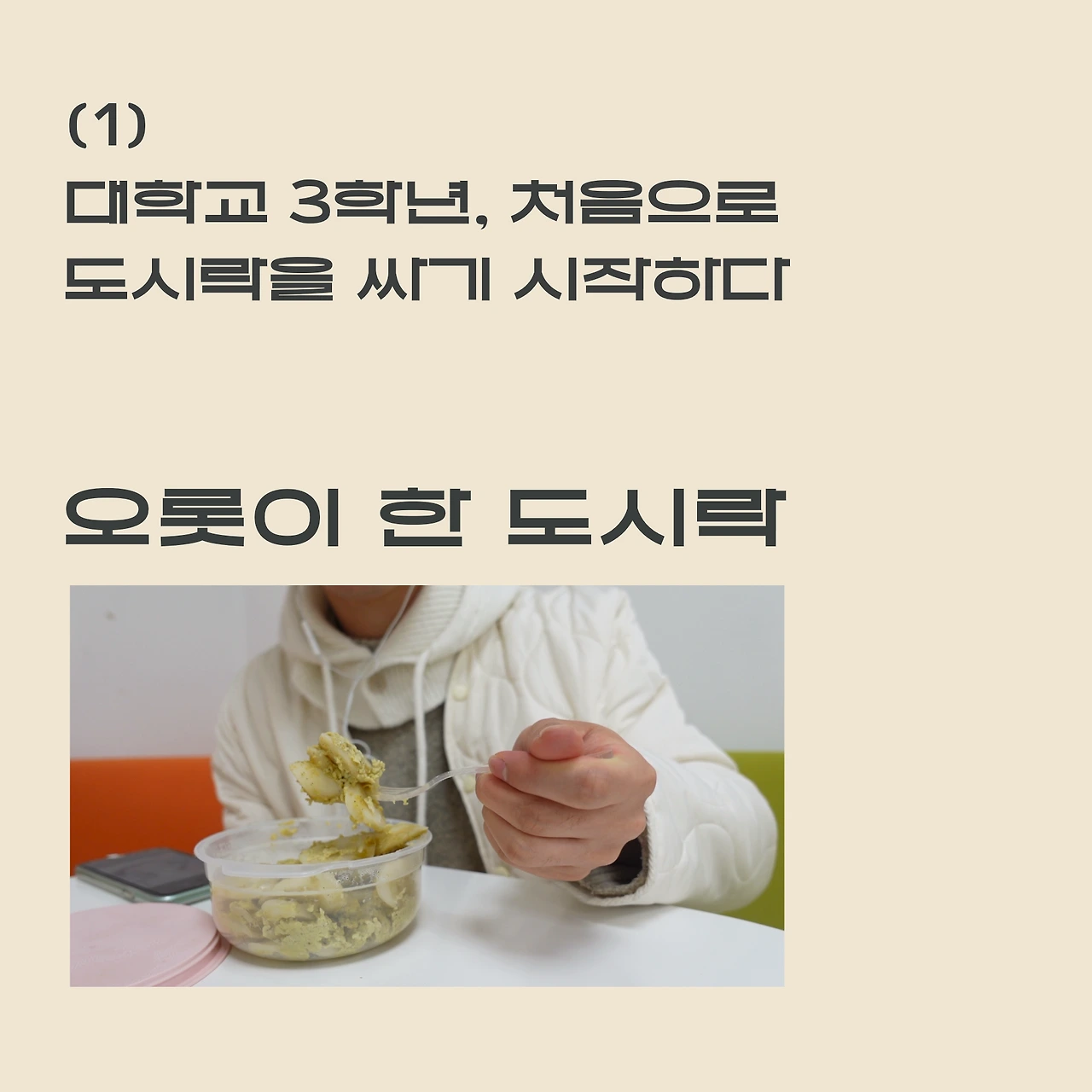 도시락을 싸서 다니는 것은 대학생활 중 꼭 해보고 싶은 것 중 하나였다. 그러나 친구들과의 시간에 푹 빠지고, 학업에 쫓기며 지내다 보니 그 로망은 자취를 감추게 되었다. 나도 남들도 대학생을 생각하면 떠올리는 그 모습 그대로 학교를 다니고 있었다. 그렇게 잊고 지내왔던 기억이 머릿속에서 활짝 피어났을 때, 어찌나 신났는지 몰랐다. 두려움과 슬픔이 기쁨과 설렘으로 역전되는 순간이었다.