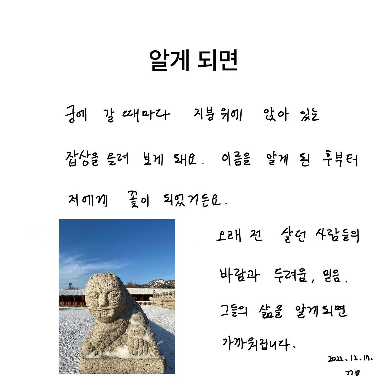따듯한 것을 좋아합니다. 학생 때는 질문이 없었는데 나이가 들면서 질문이 생겨 고생하는 중입니다.