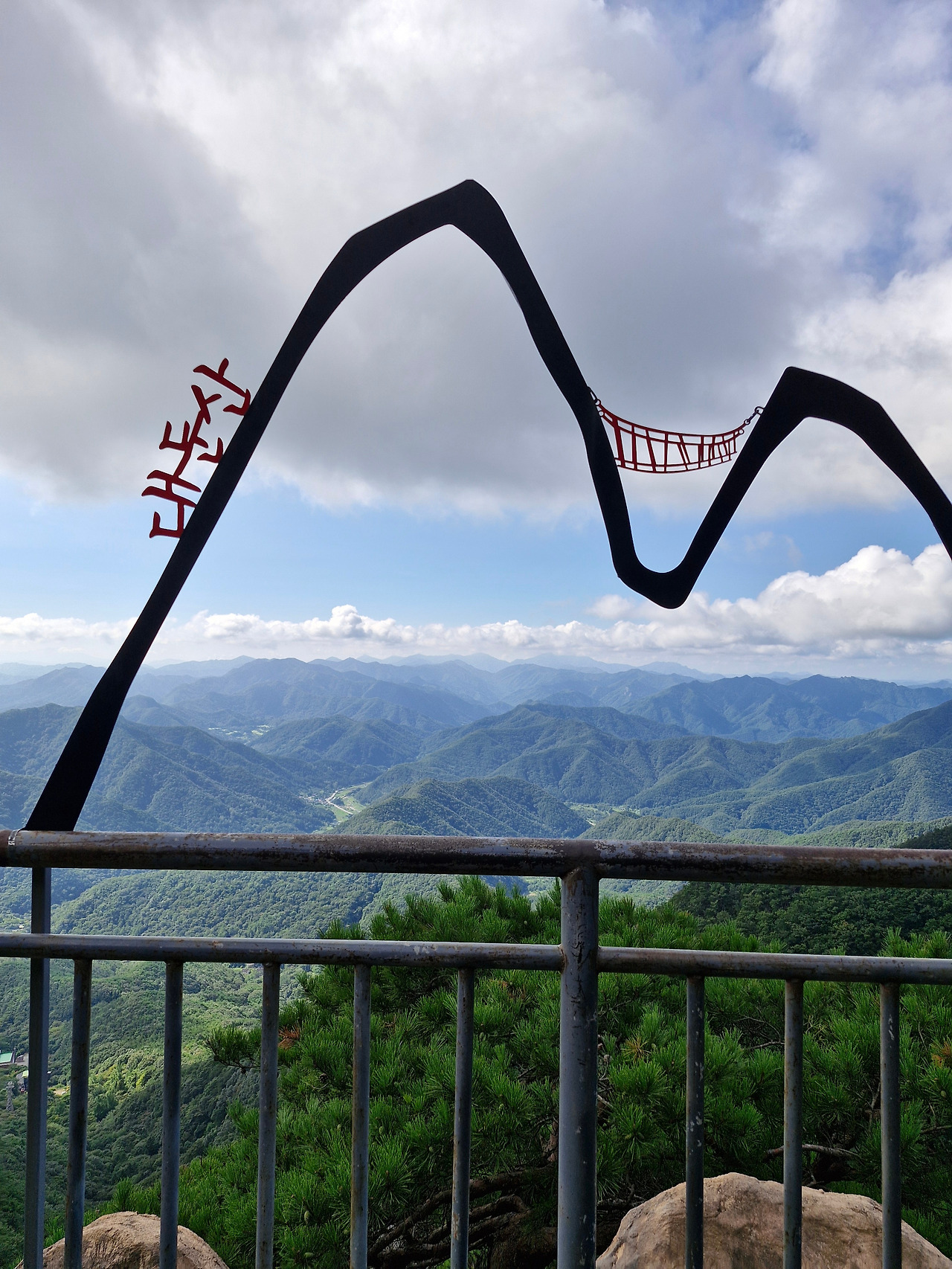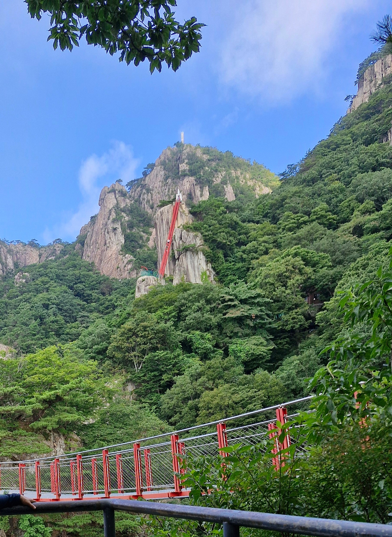 케이블카는 곧바로 산중턱을 향해 오르기 시작한다. 금방이라도 떨어질 듯한 큰 바위가 다른 바위 위에 올려져 있다. 몇천 년을 그렇게 살고 있다고 안내원이 설명을 한다. 저 멀리 기암괴석이 장관임과 동시에 악산이구나~ 케이블카에 내리니 무엇이 끌어당기기라도 하듯 마구 걷기 시작한다. 60도 각도를 리허설이라도 하는 듯 처음부터 계단이 만만찮다. 평지는 아예 보이지 않는다. 왜 구름다리까지도 대단하다 했는지 느낌이 온다.