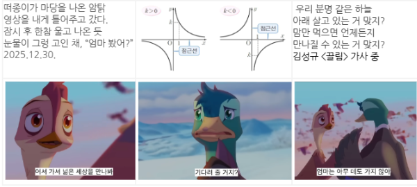 우리는 분명 같은 하늘 아래 살고 있지만, 결코 서로에게 완전히 닿을 수 없는 '점근선'의 운명을 타고났다. 수학적 세계에서 곡선이 직선에 무한히 다가가되 결코 만나지 않는 점근선처럼, 우리 삶의 궤적 또한 묘한 단절을 품고 있다. 떠종이가 보여준 영화 <마당을 나온 암탉>의 한 장면처럼, 우리는 때로 좁은 케이지(Cage) 안에 갇힌 채 창밖의 넓은 세상을 갈망하는 이방인들이다.