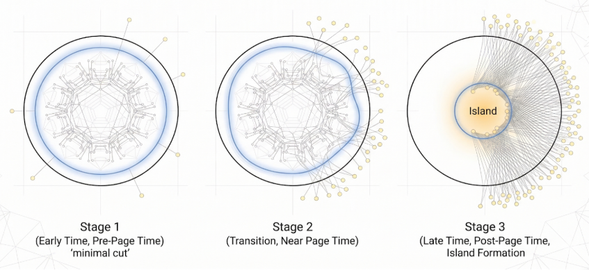 그렇게 탄생한 지대의 이름은 의외로 낭만적이다. 바로 '섬(Island)'이다. 물리적으로는 지평선 '안'에 고립되어 있지만, 정보의 관점에서는 이미 블랙홀 '밖'의 일부가 된 기묘한 지대. 우주는 오각형 그물망 위에서 가장 안전한 '절취선'을 찾아내어, 자신이 품고 있던 정보를 호킹 복사라는 형태로 세상 밖으로 소중히 흘려보낸다. 끊어진 줄 알았던 우주의 시간이 복원되는 전율의 순간이다.