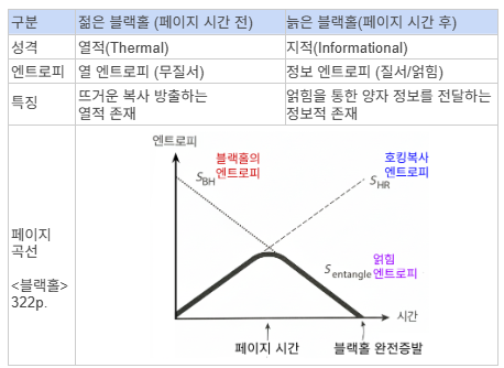 늙은 블랙홀 (페이지 시간 후): 상자 안의 퍼즐 조각이 절반 이상 쏟아져 나오는 찰나, 기적이 일어난다. 새로 나오는 조각들이 이전에 나갔던 조각들과 양자적으로 '얽히며' 비로소 하나의 그림을 완성하기 시작하는 것이다.
