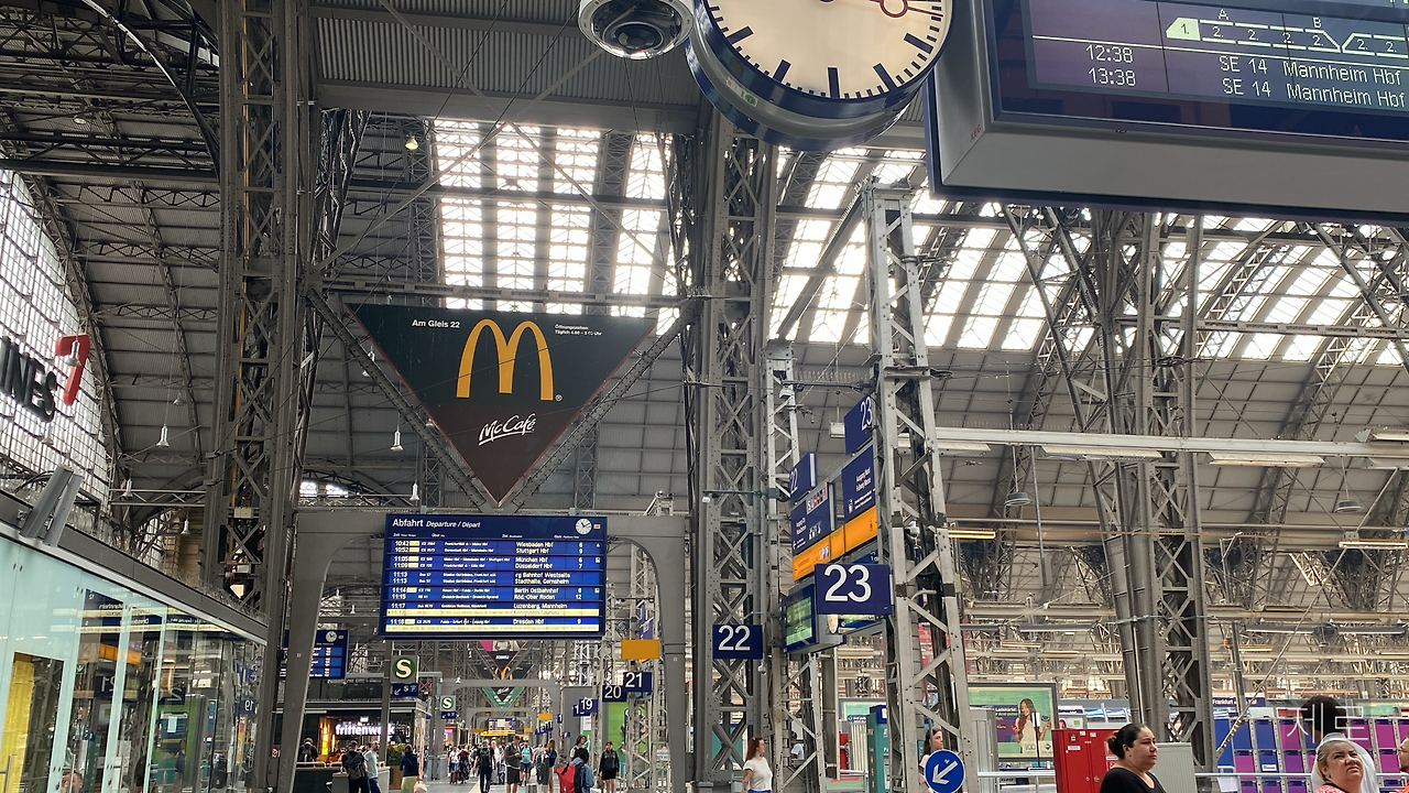 드디어 프랑크푸르트 중앙역으로 향하는 지하철 앞에 서 타려는 순간, 또 다른 남자가 내 트렁크를 집었다. 설마 이 자식, 도둑질하려는 건가 했지만 시크하게 들어다 주고 떠났다. 독일 사람들은 차가운 듯 자기 할 일만 하고 떠난다. (다 그렇다고 할 수는 없지만) 말보다는 행동파다. 여러 사람들의 도움을 받아 기차를 타고 멍하니 창밖을 보았다. 낯선 곳에서 들리는 뉴진스의 ETA. 뉴진스를 좋아해서 힘이 없을 땐 뉴진스의 노래를 듣는데, 이때가 정말 뉴진스의 노래가 필요한 순간이었다. 휴- 숨을 들이쉬고 다시 한번 트렁크를 들고는 프랑크푸르트 중앙역에 내렸다. 드디어 도착했구나! 역 주변 치안이 안 좋다는 말을 들어 몸을 본능적으로 웅크린 채 맥도널드 표지판을 발견하고 역 바로 앞 호텔로 향했다.