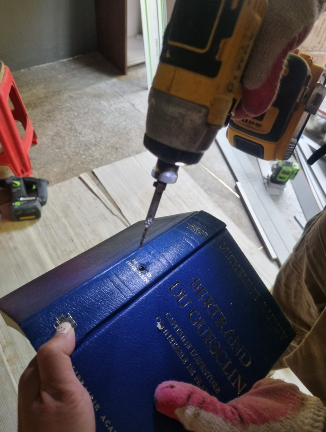 드릴로 책 등을 뚫고(책을 진심으로 사랑하는 분들께는 왠지 죄송한 마음입니다만,) 미리 인터넷으로 주문해 둔 동그란 조명을 결합해봅니다.
