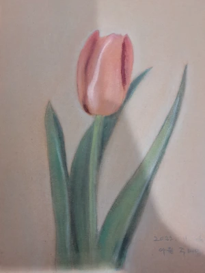 이번 수업의 주제는 꽃 그림 그리기였다. 나는 올봄 태안의 튤립 축제에 갔던 것이 생각나 튤립 한송이를 그렸다. 약 2시간에 걸쳐 정성을 다한 작품이다. 여기 올린 모든 그림들은 화장품으로 그린 그림들이다. 놀랍지 않은가? 쓰레기통에 버려질 화장품으로 이렇게 그럴듯한 작품이 완성되다니. 내가 그린 튤립 작품을 거실에 걸어두니 바라볼 때마다 기분이 좋아지고 뿌듯한 마음이 든다.