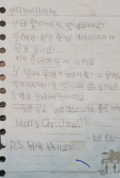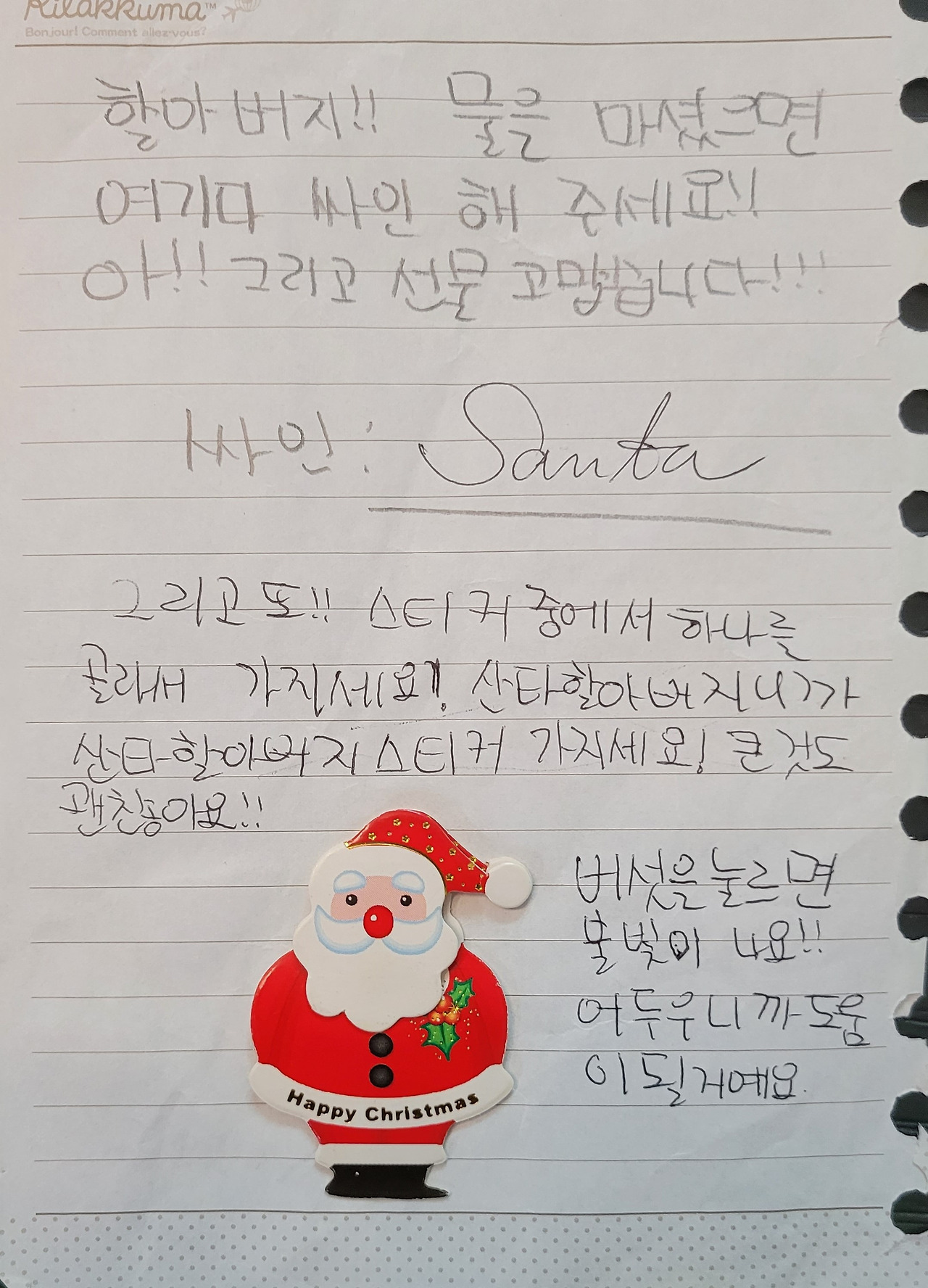한 번은, 둘째 아이가 이상하다는 표정으로 산타할아버지가 남긴 크리스마스 카드 글씨체가 엄마 글씨체와 비슷하다며 나의 표정을 살폈다. 혹시 엄마가 쓴 것이 아니냐고 말이다. 당시 아이들에게 바라는 엄마의 바람이 적혀 있었는데 산타할아버지가 어떻게 이 내용을 아느냐고도 했다.