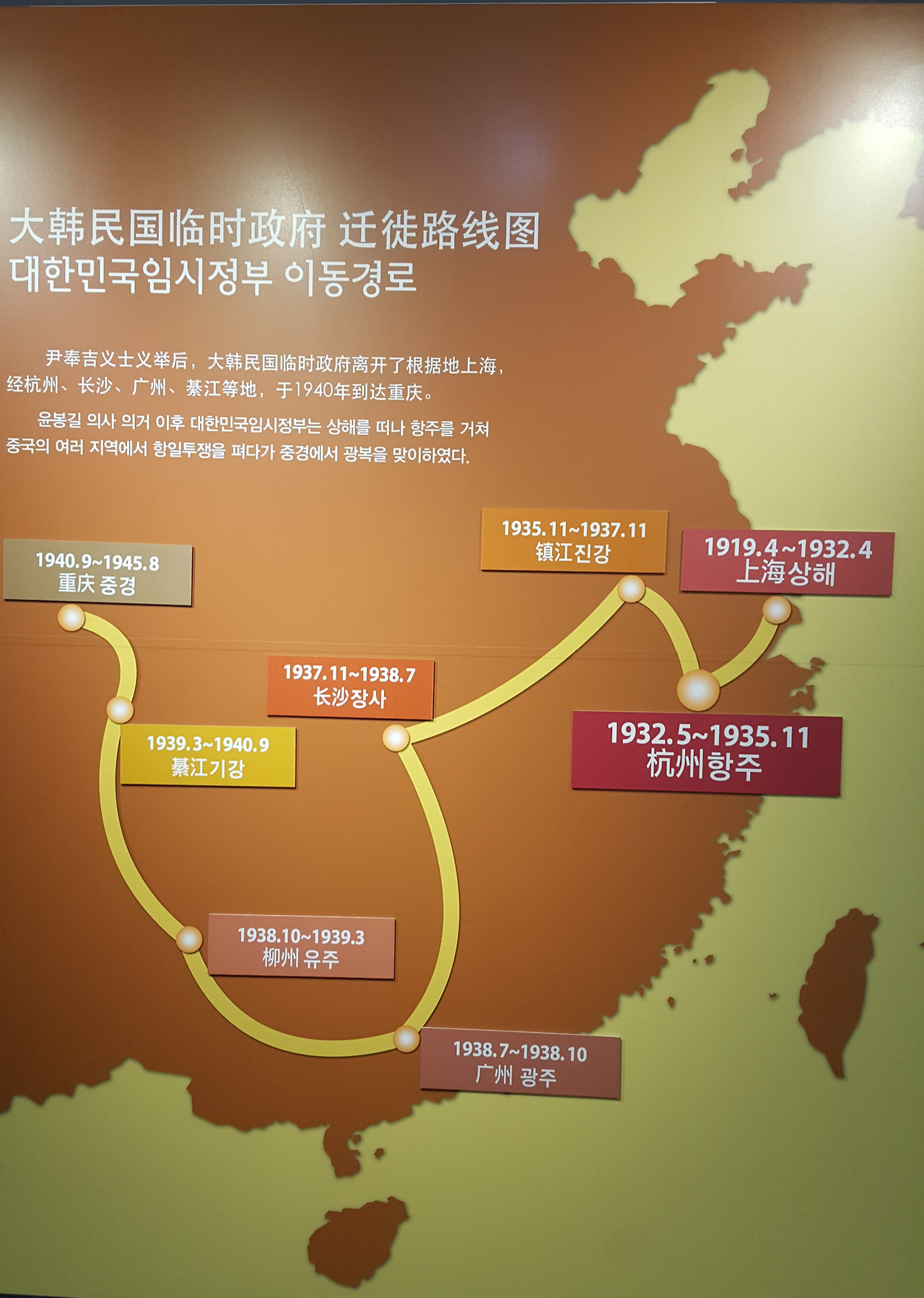 대한민국 임시정부는 1919년 4월 11일, 황제가 아닌 백성이 나라의 주인이 되는 자유롭고 독립된 나라를 만들겠다는 큰 뜻을 품고 세운 우리 역사상 최초의 민주공화정부다. 해방이 되기까지 약 27년 동안 상하이에서부터 충칭까지 일본의 감시를 피해 여러 곳을 전전하며 고난의 행군을 이어갔다. 상하이에서 있었던 13년 동안은 거의 1년에 한 번씩 거주지를 옮겨야 했고 항저우, 전장, 난징, 광저우 등 8년 동안의 이동시기를 거쳐 1940년 마지막으로 충칭에 새 둥지를 튼 후에도 광복할 때까지 세 번이나 옮겨 다녀야 했다. 그 이동 거리는 무려 5000km가 넘는다.