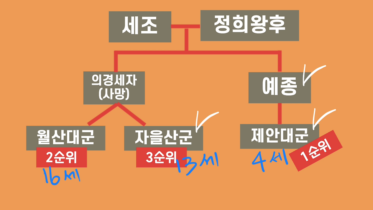 죽은 형 의경세자를 대신해 왕위를 이은 예종은 두 번째 왕비인 안순왕후 사이에서 제안대군을 뒀으니 제안대군이 승계 1순위다. 그리고 의경세자와 인수대비 사이의 큰아들 월산대군이 2순위, 둘째 아들 자을산군이 3순위다. 그런데 1순위 제안대군은 나이가 불과 4살, 그렇다면 다음은 월산대군인데 왕위 계승에 대한 권한을 지닌 정희왕후는 3순위인 자을산군을 선택했다. 제9대 왕 성종이다. 월산대군이 16살, 자을산군이 13살이었으니 월산대군이 승계하는 게 자연스러운 수순이었는데, 정희왕후는 월산대군이 병약하다는 이유로 그렇게 하지 않았다.