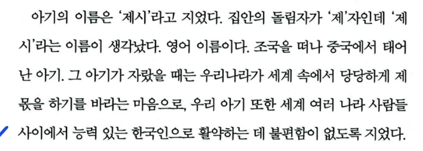 “아이가 자라면, 우리나라가 세계 속에서 당당히 자기 자리를 찾고, 그 빛을 잃지 않고 살아가길 바라.”