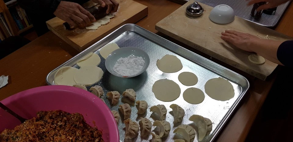 만두는 혼자 빚는 것보다 여럿이서 분업(?)을 하면 좋다. 옛날이야기 들어가며 한쪽에서 만두피를 동그랗게 밀어주면 한쪽에서는 만두소를 넣고 빚는 식으로.