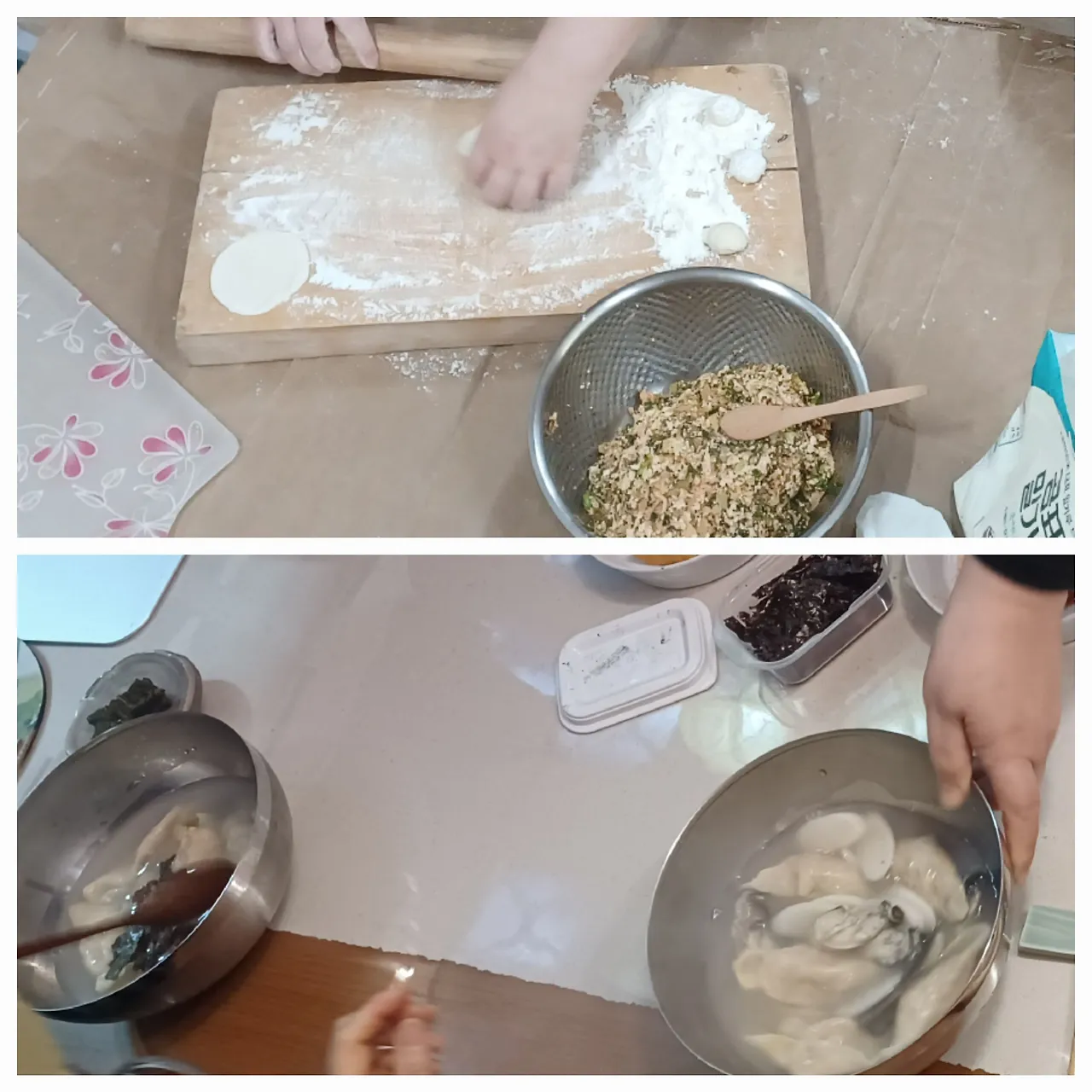 방의 절반은 차지하는 것만 같은 그 둥글고 얇은 반죽 판에 스텐 밥그릇 또는 두 되짜리 양은 주전자 뚜껑으로 꾸우욱- 눌러 동그란 모양의 동그란 만두피가 생겼다.