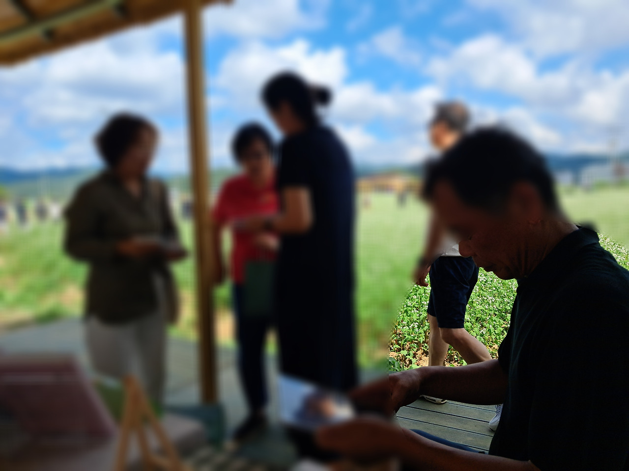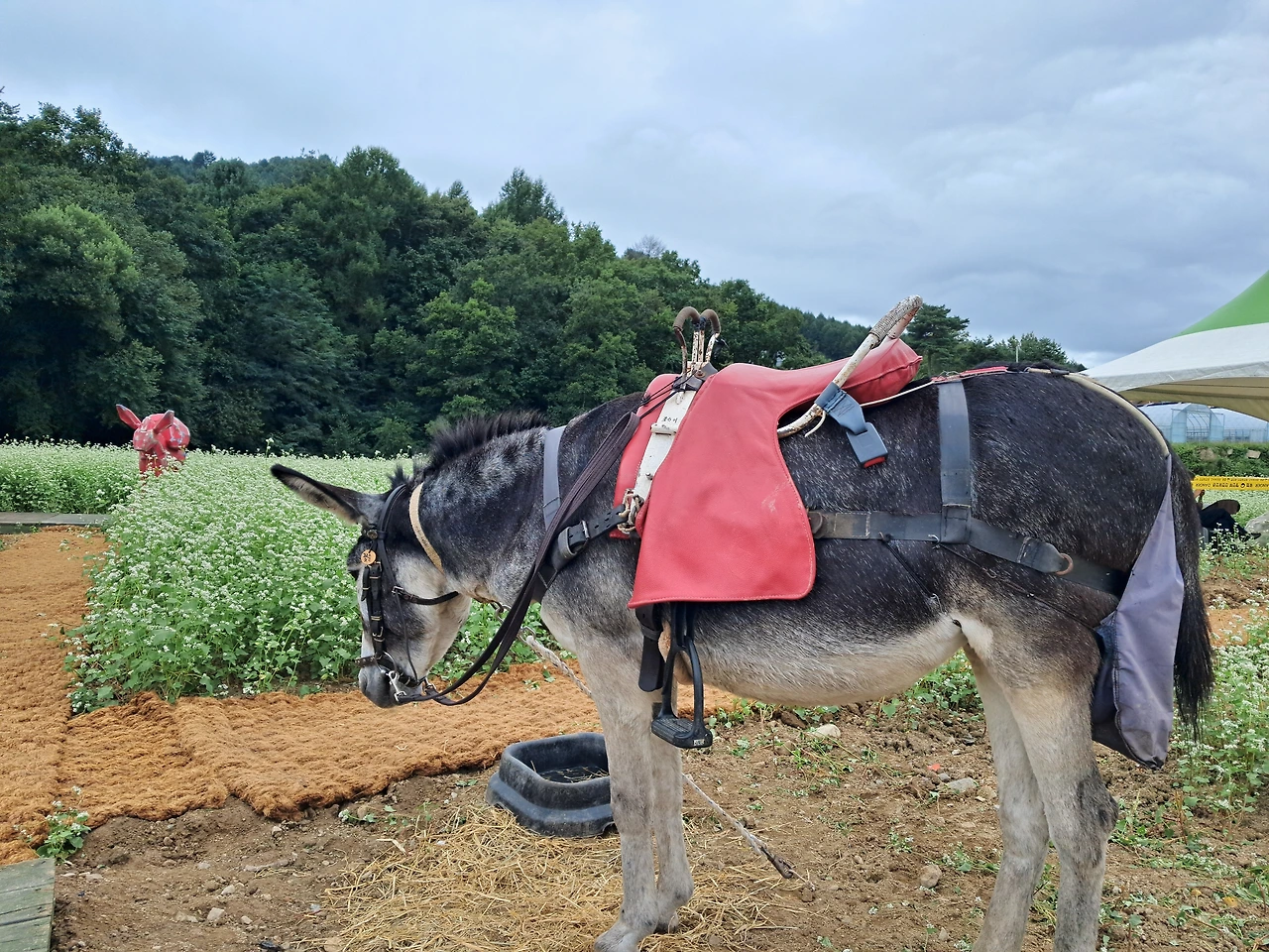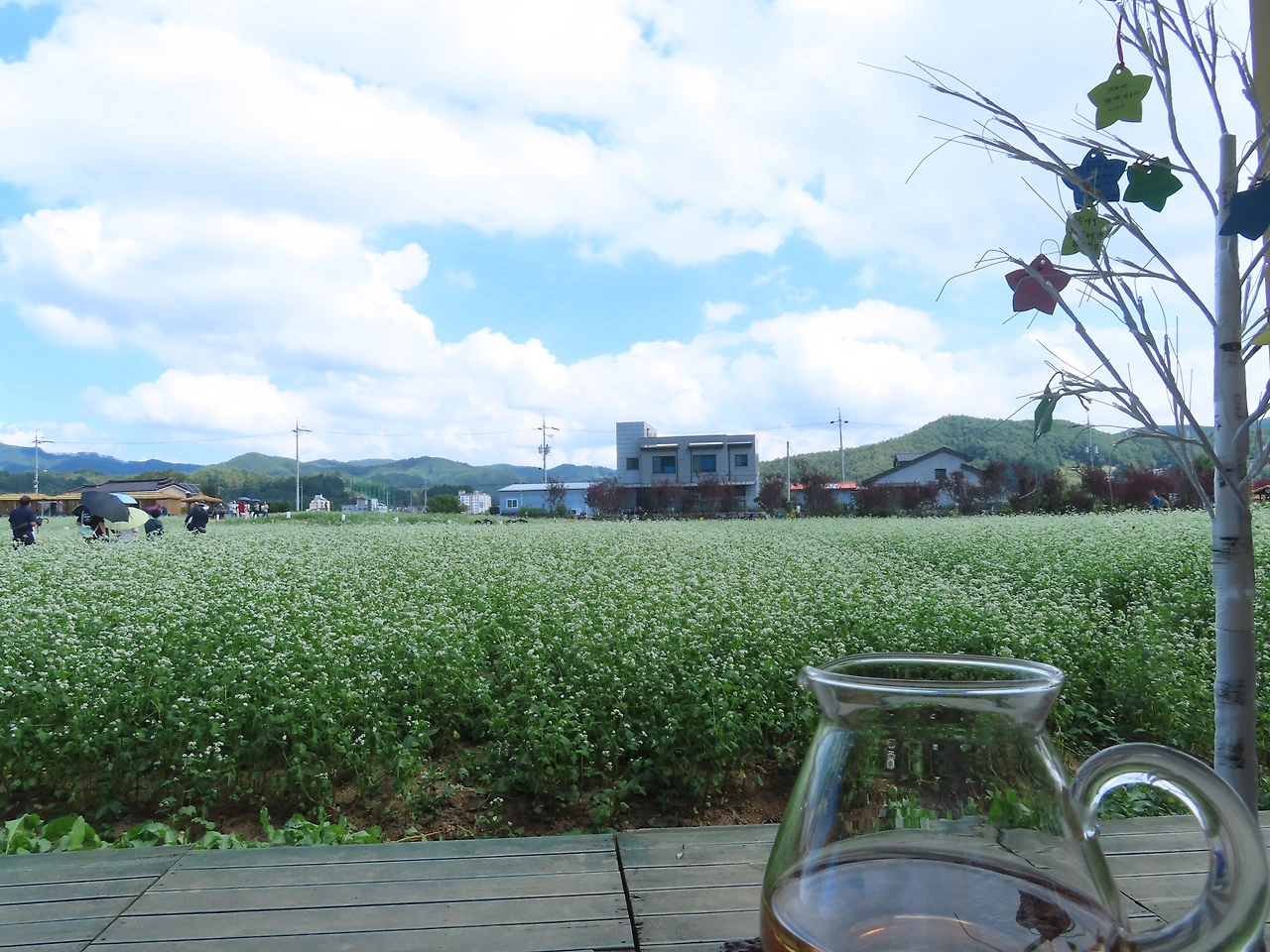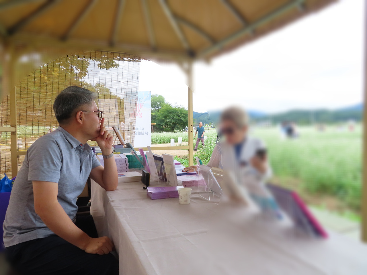 메밀꽃을 배경으로 사진을 찍으면 보기 좋을 이른바 포토존(Photo zone)이 우리 부스 바로 앞에 있었다. 메밀밭 이랑으로 조금만 들어가면 두세 명 정도 앉을 수 있는 나무 의자가 있지만 사람들은 굳이 밭 안으로 들어가 사진을 찍었고 그 모습을 본 다른 사람들은 그곳을 목표로 걸어온다.