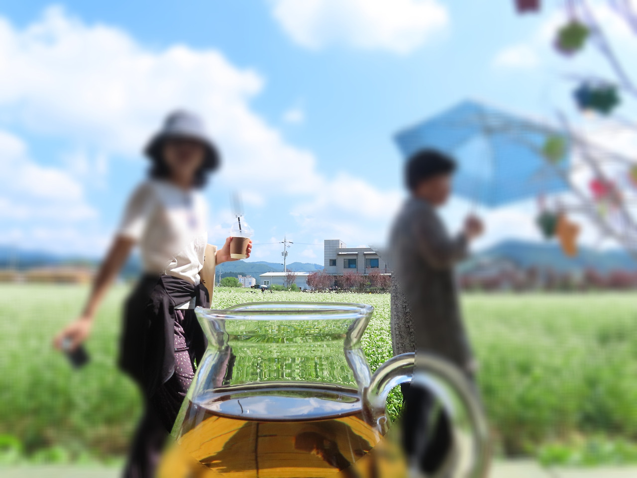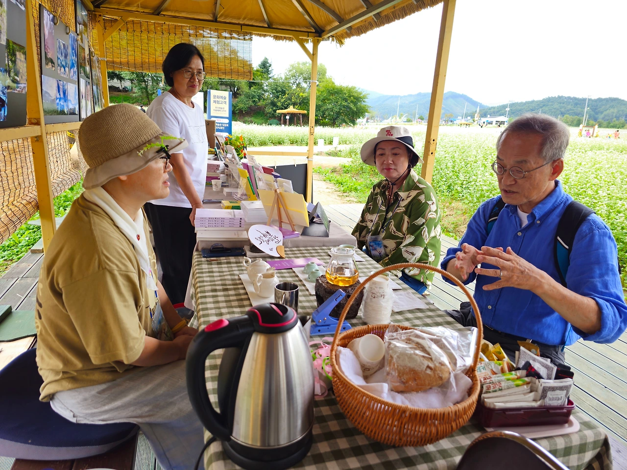 울긋불긋 그러나 비슷비슷한 아웃도어를 입은 사람들은 삼삼오오 사진을 찍으면서 다니다가 '저기는 뭘 파는 곳일까'하는 호기심으로 한둘이 우리가 있는 곳까지 들어오기도 했다. 책들이 펼쳐져 있어도 차를 우려내고 있으니 "메밀차 파는 덴가 보네." 하면서 두세 걸음 들어오다가 바로 돌아서 나가는가 하면 어떤 이들은 돌아다니느라 목말랐다며 좋아라 마시고 가기도 했다.