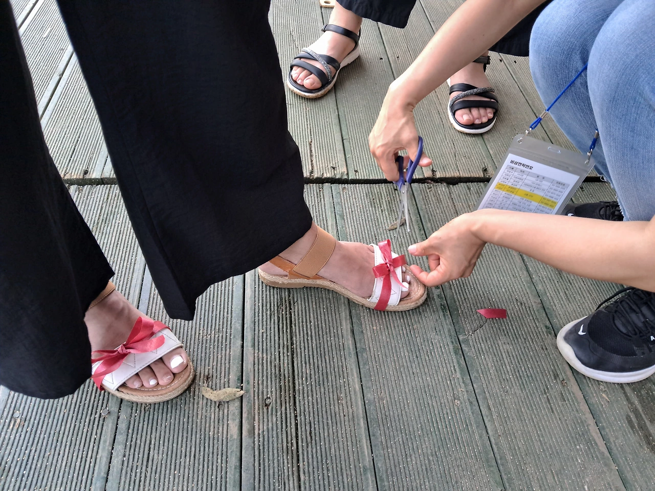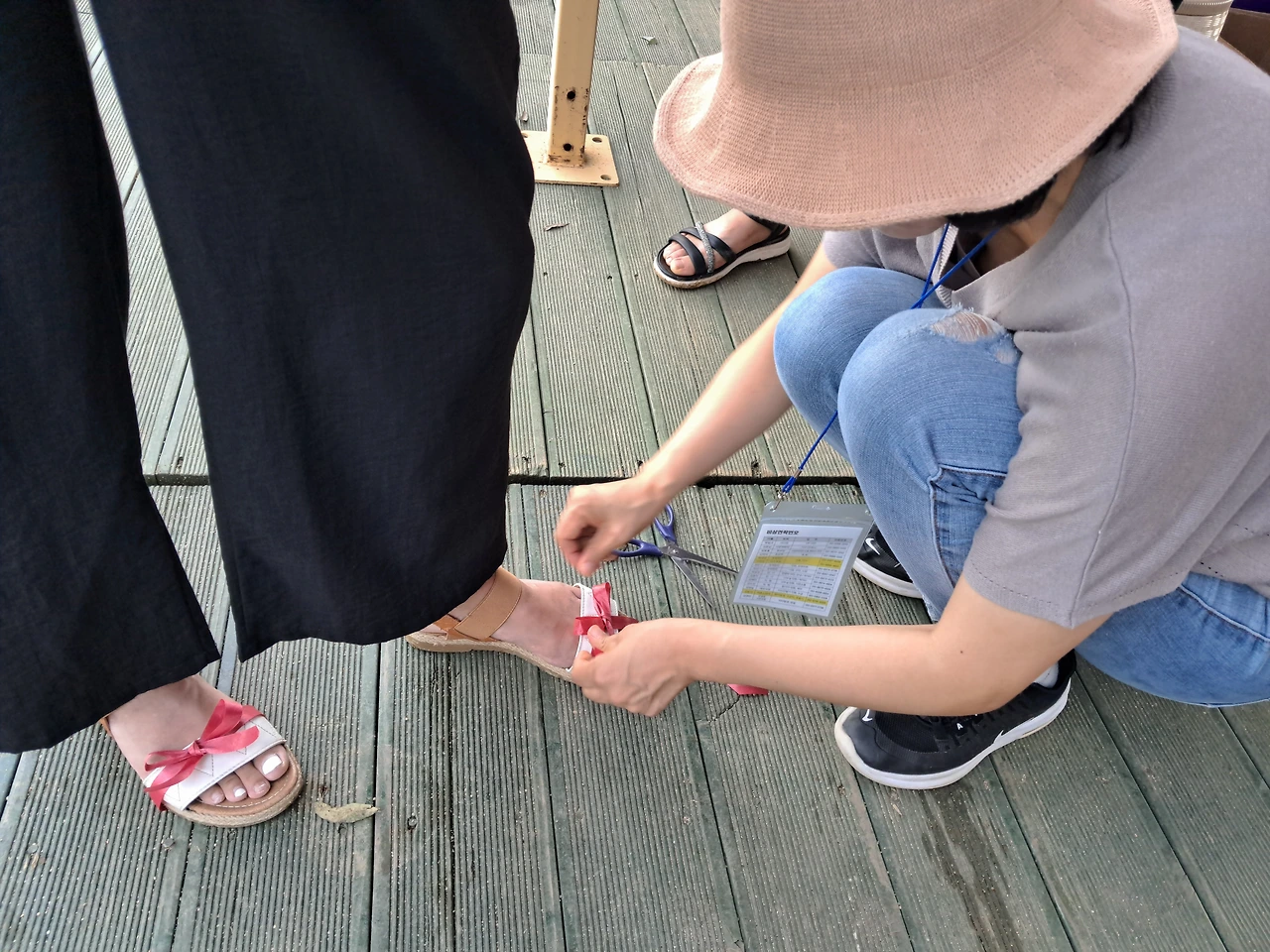 마침 그 모습을 본 체험 길라잡이 미연 氏가 노끈을 가지고 샌들끈을 만들어 준다.