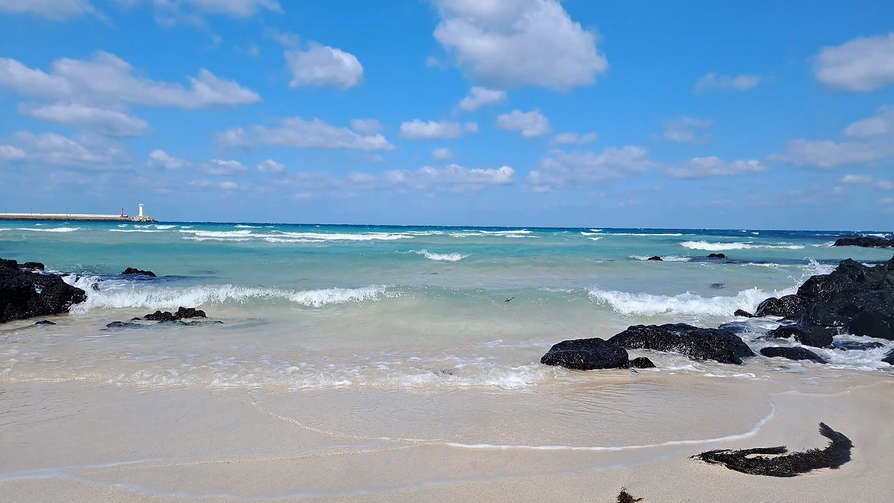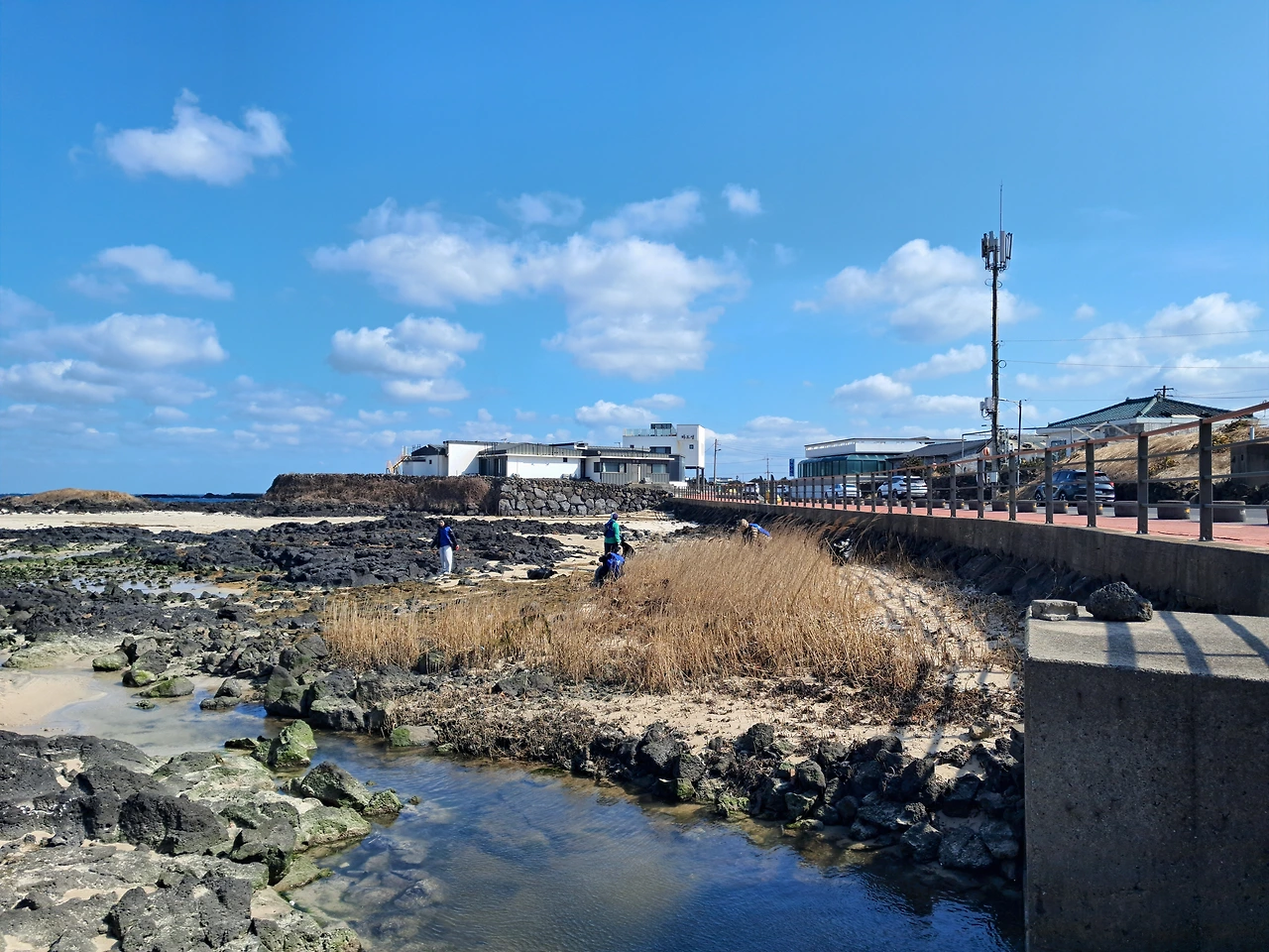 시간 가는 줄 모르고 주웠던 그곳은 바닷물이 검은 바위로 밀려왔다 밀려가는 곳, 관광객들이 차를 잠시 세우고 바다를 바라보거나 천천히 오가는 도로 사이 한쪽 옆에는 담수가 흐르고 있었다.
