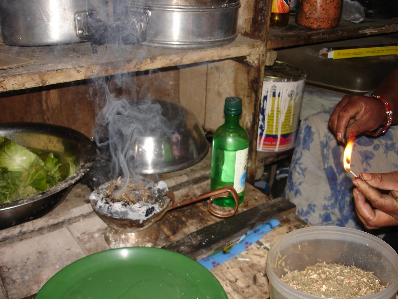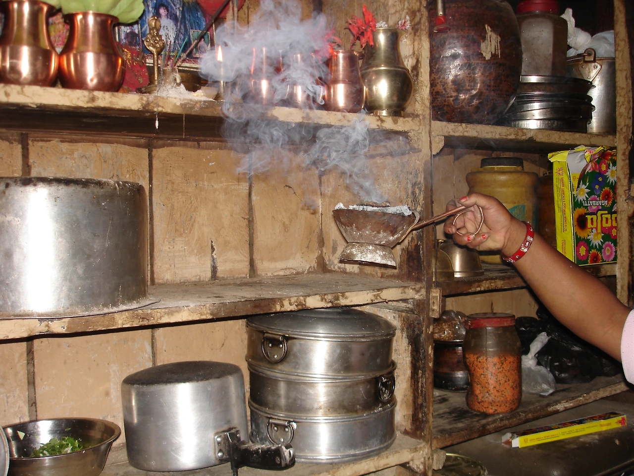안주인은 먼저 부엌에 있는 단에 물과 꽃 그리고 향을 올리고는 향불을 피워 곳곳을 돌아다니는 거야.
