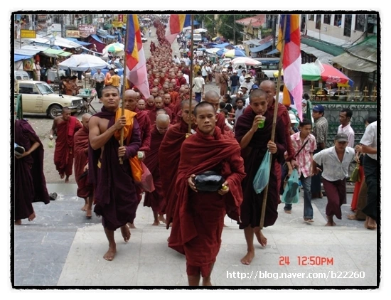 우리나라 또는 서양에서 미얀마에 수행 또는 순례 여행을 하러 간 이들이, 발우를 안듯이 들고 걸어가는 승려의 행렬을 보거나, 그 행렬을 기다리는 신도들이 흰쌀밥을 가득 담은 큰 그릇과 주걱을 들고, 아이들까지 데리고 나와 공손하게 스님의 발우에 밥을 퍼주고는 길바닥에 엎드려 절하는 모습을 보면 불교 국가임을 실감하면서 신심(信心)과 환희심이 일어난다는데도, 휴는 무슨 심뽀인지 그 너머의 어떤 걸 보고 싶었다.