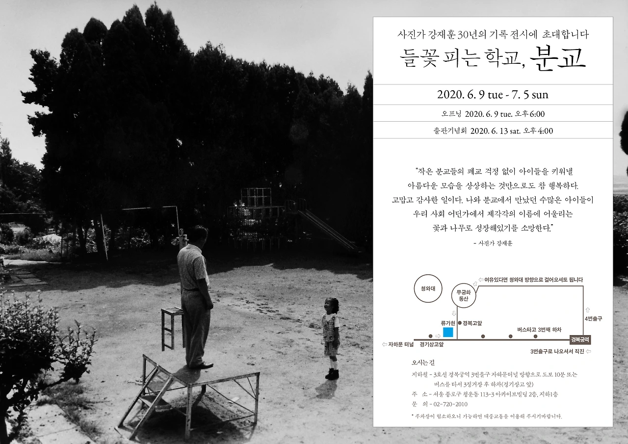모두가 숨죽인 순간. 바람결을 따라 흔들리는 플라타너스의 몸짓이 귓가에 걸린다. 나는 마른 침을 삼키고, 백팀의 바통을 꾹 움켜쥔다. ‘땅’ 하는 총성과 함께 터져 나오는 환호성. 심장이 울려서 터질 듯 하다. ⠀ 구름이 증발한 하늘에 만국기가 푸짐하게 걸렸다. 이름도 정겨운 가을 운동회날. 옷장 맨 구석에서 새하얀 운동회복을 꺼내 입고, 내친김에 새 양말까지 끼워신는다. 언덕을 내려가는 발걸음이 유난히 가볍다. 백팀의 승리를 위하여. 후회 없이, 기왕이면 멋지게 달리고 싶다. 상긋 웃으며 의지를 다진다. ⠀ 선생님은 그를 사진기자라고 소개했다. 묵직한 카메라 가방을 어깨에 둘러메고 슬기로운 샘터에 등장한 중년의 남자. 스물 댓 명의 분교 아이들은 호기심 어린 눈빛으로 정면을 바라보다가, 외지인을 향해 하나둘 박수를 건넸다. 그날부터 아저씨는 우리 분교의 식구가 되었다. ⠀ 틈만 나면 셔터를 눌렀다. 그는 우리의 모습을 담는다고 했다. 슴슴한 일상을 기록한 사진이 신문에 나오고, 잡지에도 실린다고 설명했다. 한겨레는 서울에 있다고 하던데. 어린 마음에 아저씨의 근태를 걱정한 적도 있었다. 어쨌든 찍어준다니, 아이들은 카메라 렌즈를 있는 그대로 받아들였다. ⠀ 그맘때쯤 분교 뒤편의 관사에서는 긴급회의가 열렸다. 어른들의 표정은 하나같이 진지했다. 안건은 ‘폐교’였다. 정부는 산발적으로 흩어져 있는 분교들을 읍내의 본교가 흡수하길 바랐다. 하나의 배움터에서 많은 아이들이 양질의 교육을 받아야 한다는 취지였다. 그건 하나만 알고, 둘은 모르는 처사였다. 분교는 학교를 넘어서, 태동하는 심장이었다. 폐교는 작은 마을의 심정지 선고와 같았다. 관사에서는 자주 고성이 오갔다. ⠀ 마을 어르신들이 순서대로 낚싯대를 잡았다. 원통 안으로 플라스틱 바늘을 집어넣는 일에 성공하면, 남은 일은 우리의 몫이었다. 비좁은 원통에는 소소한 경품들이 쌓여있고, 한 아이가 웅크리고 있었다. 이번에는 작지만 알찬 선물을 드려야지. 아니다, 큰 놈으로 걸어드릴까. 바깥에서 담배집 할머니, 오미자집 할아버지의 경쾌한 웃음소리라도 들리면, 세상 뿌듯함이 넘쳤다. ⠀ 가을 운동회날, 젊은 부모들이 온 동네를 돌며 어르신들을 모시고 온 까닭은 무엇일까. 아마도 이제 막 달리기를 시작한 아이들이 주변을 돌아보면서 앞으로 나아가길 바란 건 아니었을까. 정면만 보면서 질주하지 말고, 조금 늦더라도 옆 사람을 챙기길 바라는 부모의 마음. 나는 그리 짐작할 뿐이다. 그날도 희끗한 머리의 사진기자는 온종일 카메라 셔터를 눌렀다. ⠀ 열 손가락이 고드름이 되도록 추운 날이었다. 서부지검 근처의 조개탕집이었던가. 뜨끈한 국물을 뜨고는, 소주잔을 부딪혔다. 아저씨와 단둘이 마주 앉은 일은 처음이었다. 그는 여전히 아이들의 소식을 궁금해했다. 족히 십 년은 전국의 작은 분교들을 돌면서, 수많은 아이들을 만났을 텐데. 타성에 젖지 않은 눈빛이 인상적이었다. 소주 한 병이 밑바닥을 드러냈을 무렵, 그는 말했다. 소위 ‘높은 사람’들이라 불리는 관료와 정치인에게 열심히 분교 이야기를 했다고. 그들 가운데는 대통령도 있었다. 그는 만국기에 걸린 이상을 올려다 보며, 흙바닥에서 발을 굴렀던 셈이다. ⠀ 나는 분교에서 무사히 졸업했다. 내 동생도 그랬다. 아저씨는 사진전을 알리는 글에 오랜 소망 하나를 적었다. ⠀ ‘나와 분교에서 만났던 수많은 아이들이 우리 사회 어딘가에서 제각각의 이름에 어울리는 꽃과 나무로 성장해있기를 소망한다.” ⠀ 요새 어른이란 말이 부끄럽다. 어떤 날은 이루 말못할 처참한 장면들이 보도전문 채널을 메우기도 한다. 들꽃에겐 잘못이 없다. 그는 일찍이 알고 있었다. 오늘은 아저씨를 보러 간다.