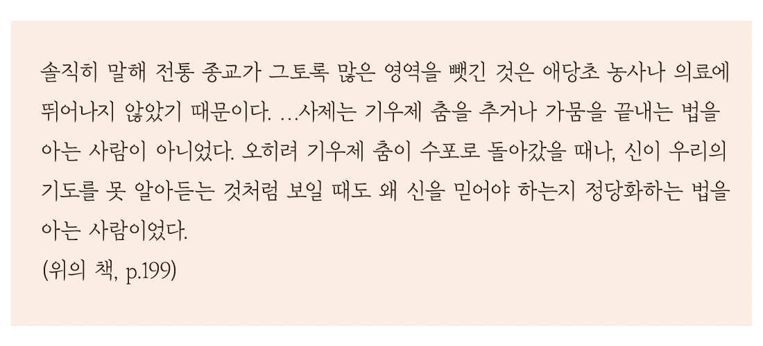 자연현상을 일으키는 막대한 파워를 가진 자연과 곳곳에 존재하는 세상의 신비는 사람들을 신앙으로 이끌었다. 인간이 종교의 힘을 빌어 대집단을 구축하기 시작하자, 종교의 권위가 집단의 리더에게 이식되어 카리스마 있는 제사장이 출현했다. 절대적 존재와 소통함으로써 그는 집단 내에서 정치적 권위를 보유할 수 있게 되고, 당위성을 띠는 집단 규범을 제시하는 존재로 올라설 수 있었을 것이다. 세상의 원리에 대한 간단명료한 해답을 제시하는 것의 위력은 실로 대단했다.