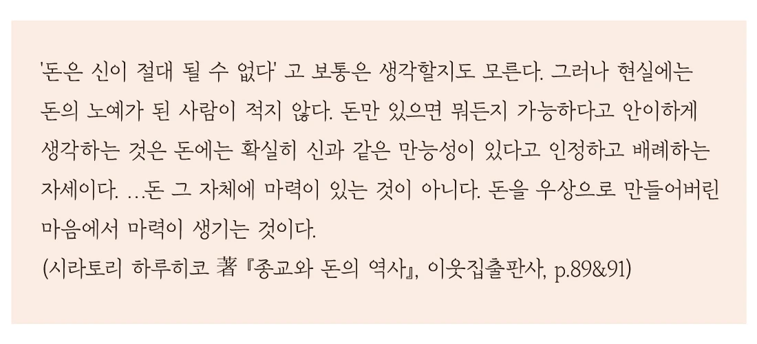 인간이 본격적으로 대담해지기 시작한 것은 돈이 퍼져나간 이후였다. 재화를 이용할 권리를 부여하는 돈은 자유의 크기를 좌우했다. 간절한 믿음이 정신적인 위안을 줄 수는 있지만, 사람의 생활수준을 올려주지는 못한다. 사람들은 종교가 설치한 지배적인 사회 규범을 따르되, 현실에서는 돈에 이끌려 다니는 삶을 살았다. 입으로는 신의 말씀을 읊지만 손은 재물로 향하고, 가슴에서 믿음과 욕망이 상충한 것이다.