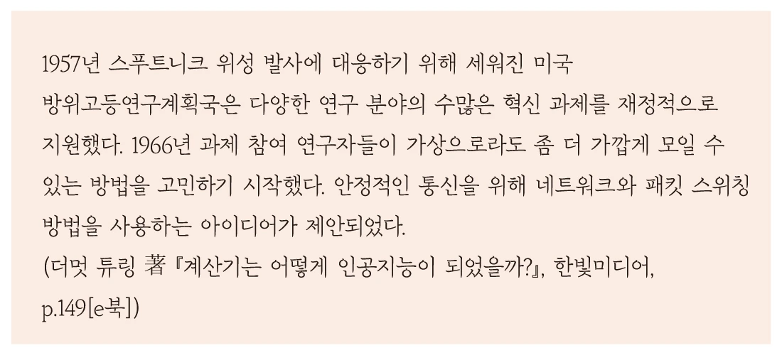 냉전에 돌입한 20세기 중반, 미국 국방부는 군사적 위험 상황에 대처하기 위해 전국 연구 기관의 힘이 필요했다. 그러나 당시의 통신 수준으로 서부의 UC 버클리와 동부의 MIT 연구원들이 효과적인 커뮤니케이션을 하는 것이 어려웠다. 고심 끝에 곳곳에 깔아 둔 전선으로 컴퓨터들을 연결하고, 전기 신호를 이용해 상호 소통이 가능하도록 하는 방식이 시도되었다. '아파넷(ARPANET)'이라 불린 이 시스템은 대륙을 관통하는 새로운 소통 수단으로 떠올랐다.