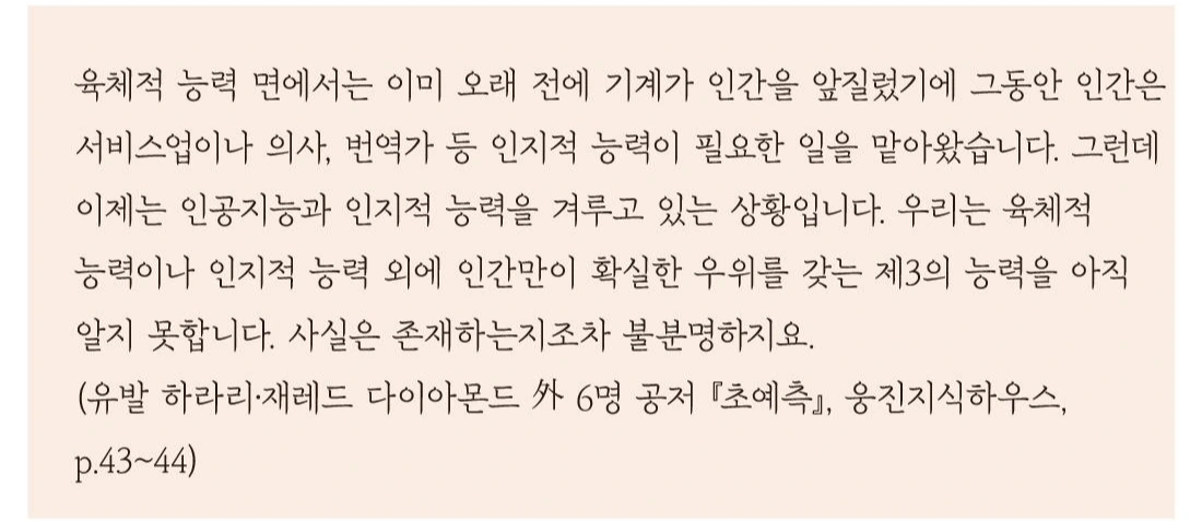 방적기는 노동자보다 빠르게 실을 뽑아낼 수 있었고, 심지어 쉬지도 않고 작업을 진행할 수 있다. 반도체 속의 극소 단위 공정에서 기계는 인간의 손이 할 수 없는 일을 할 수 있다. 그런데 그것을 넘어서 기계가 사람보다 계산도 더 잘할 수 있고, 운전도 더 안전하게 할 수 있다면? 인간보다 비용 대비 더 나은 생산성을 창출할 수 있다면, 그리고 그런 생산성의 역전이 지금보다 훨씬 광범위한 곳에서 일어난다면 무슨 일이 생길 것인가?