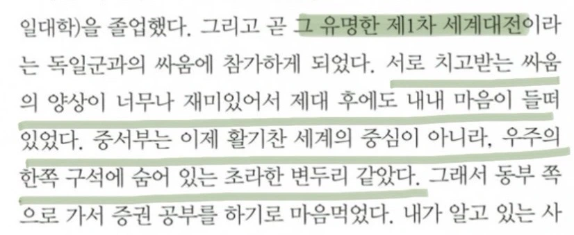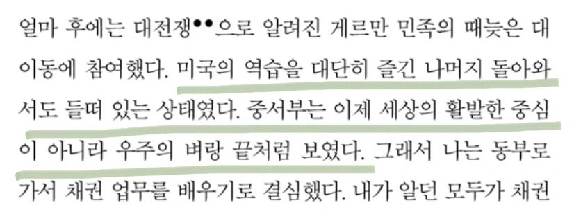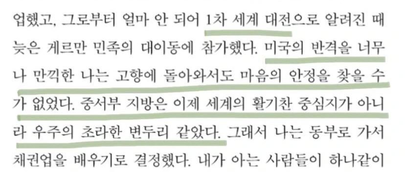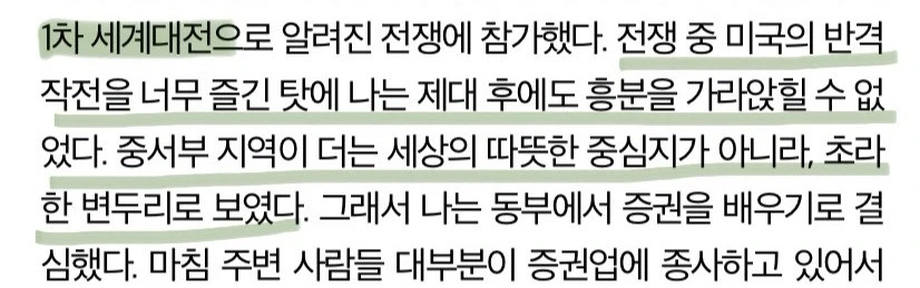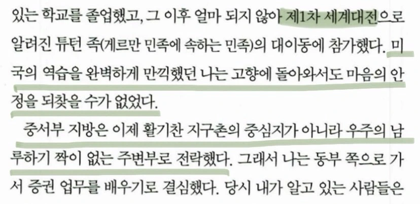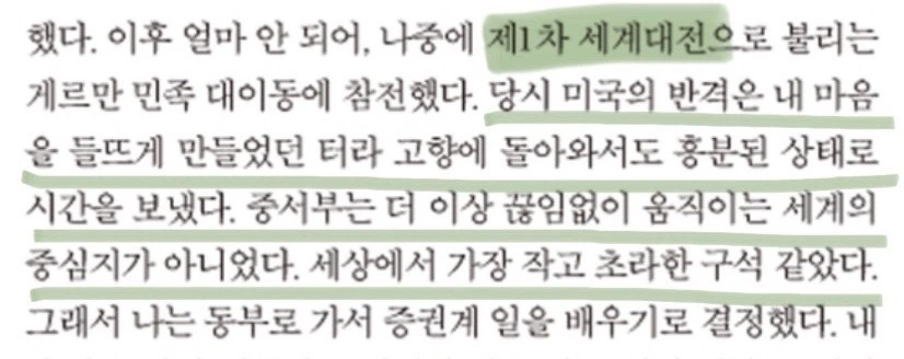 이어서, 예일 대학을 졸업하고 1차 세계 대전 참전 후 고향으로 돌아와 동부로 가서 살 결심을 하는 대목.