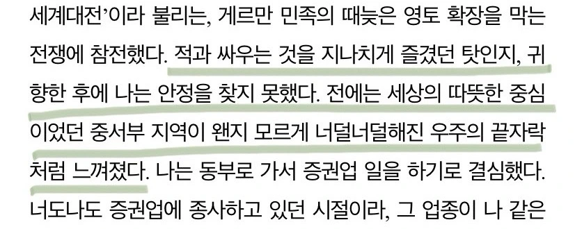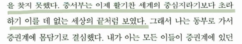 ‘하도 신이 났던 터라’. 반복되는 오독. ‘마음의 안정을 찾지 못했다‘에서 톤을 눈치챘나 싶다가 뒷문장에서 여지없이 무너진다. ‘활기찬 세상의 중심’ vs ‘초라한 세상의 끝’ X
