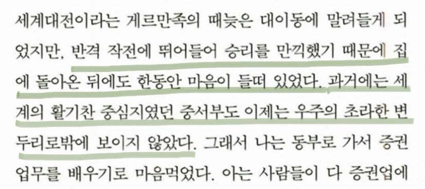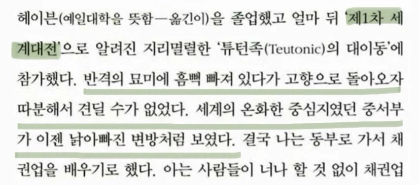 Fail. 게다가 ‘지리멸렬’은 어디서 튀어나온 말인지 모르겠다. delayed Teutonic migration 을 어찌할 바 몰라 그렇게 ‘처리’ 한 것으로 보인다. delayed의 의미는 1차 세계 대전 발발하고 한참 후(2년 후)에야 미국이 참전했기 때문에 닉이 냉소적으로 붙인 말.