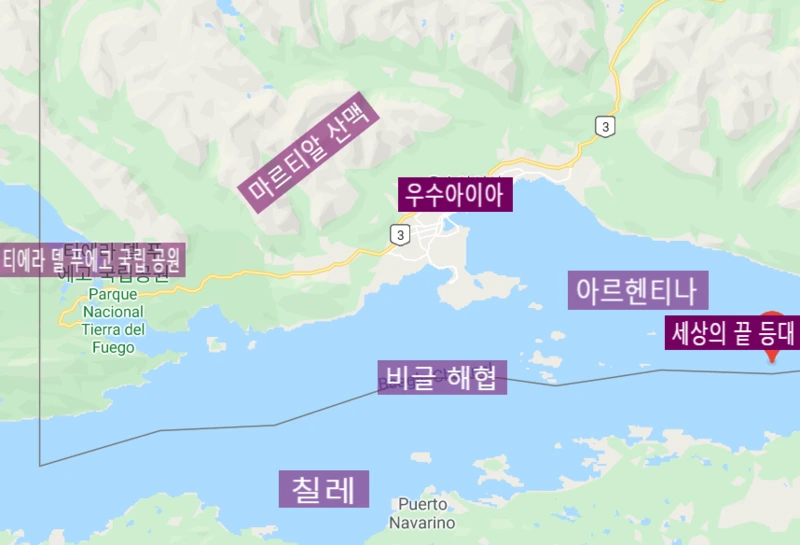 우수아이아는 남아메리카 대륙 남쪽 끝에 있는 티에라델푸에고 제도에서 가장 큰 섬이다. 마젤란(포르투갈 탐험가, 1480~1521)이 처음 이곳에 도착했을 때 원주민들이 절벽 위에 피워 놓은 모닥불이 활활 타오르는 모습을 보고 붙인 이름이 ‘불의 땅’ 즉 ‘티에라 델 푸에고’(Tierra del Fuego)이다.