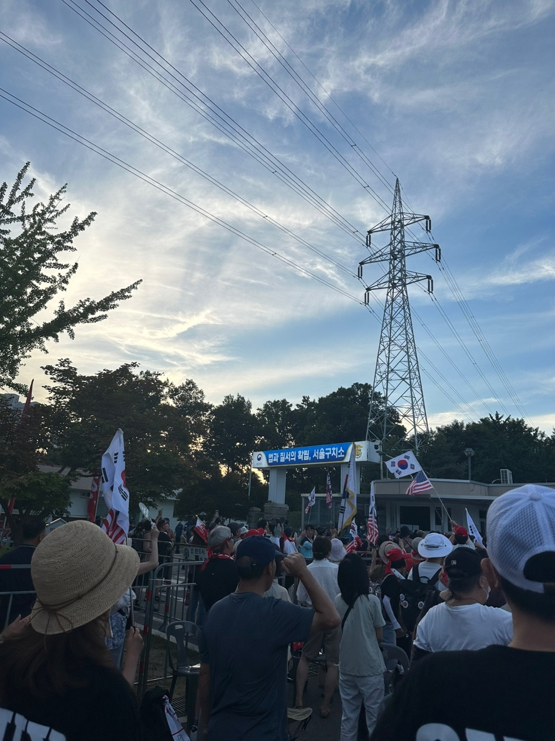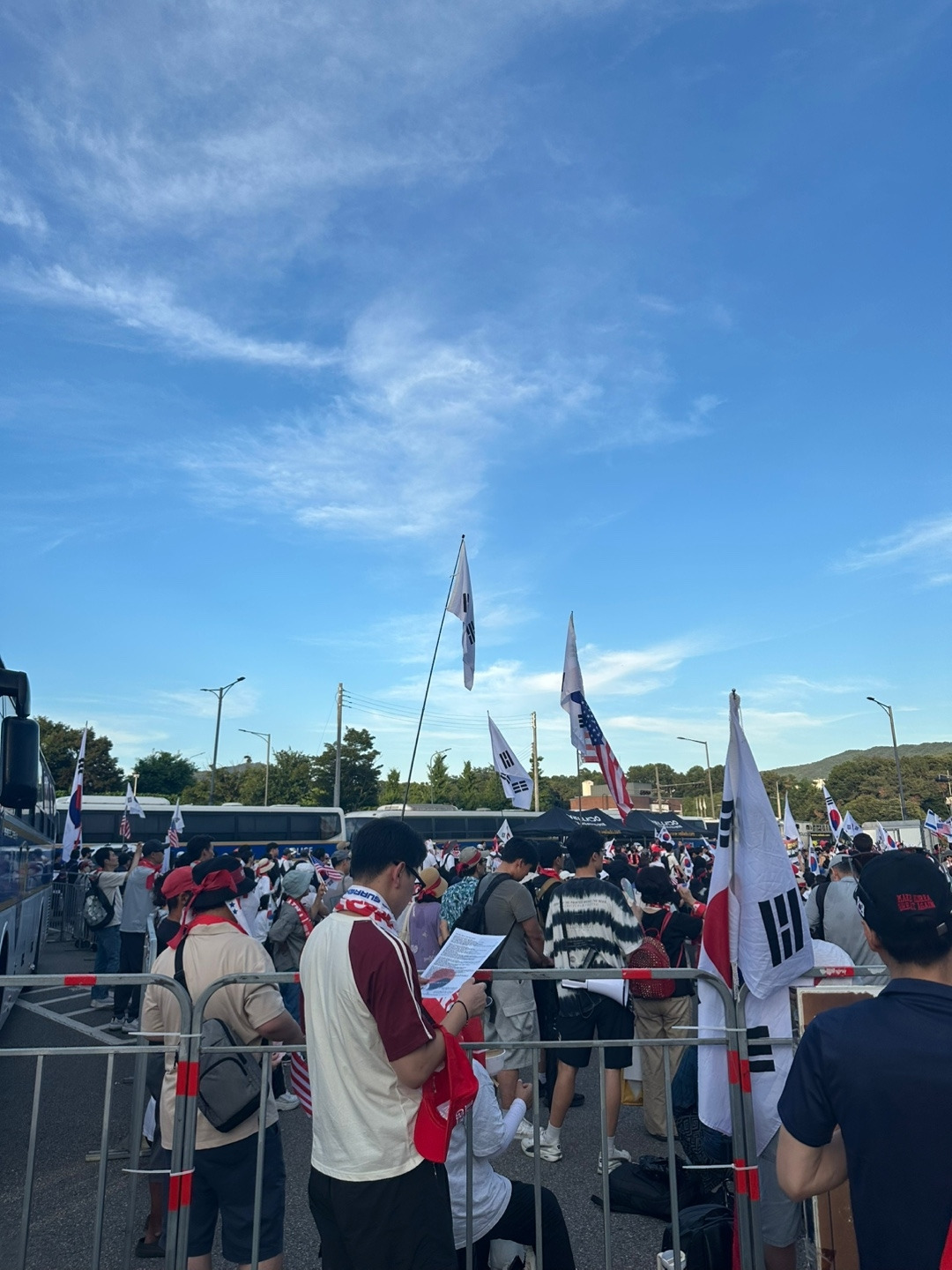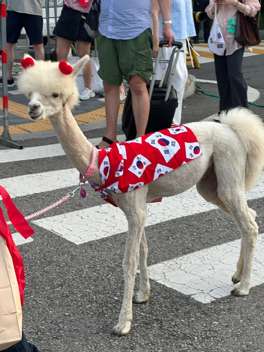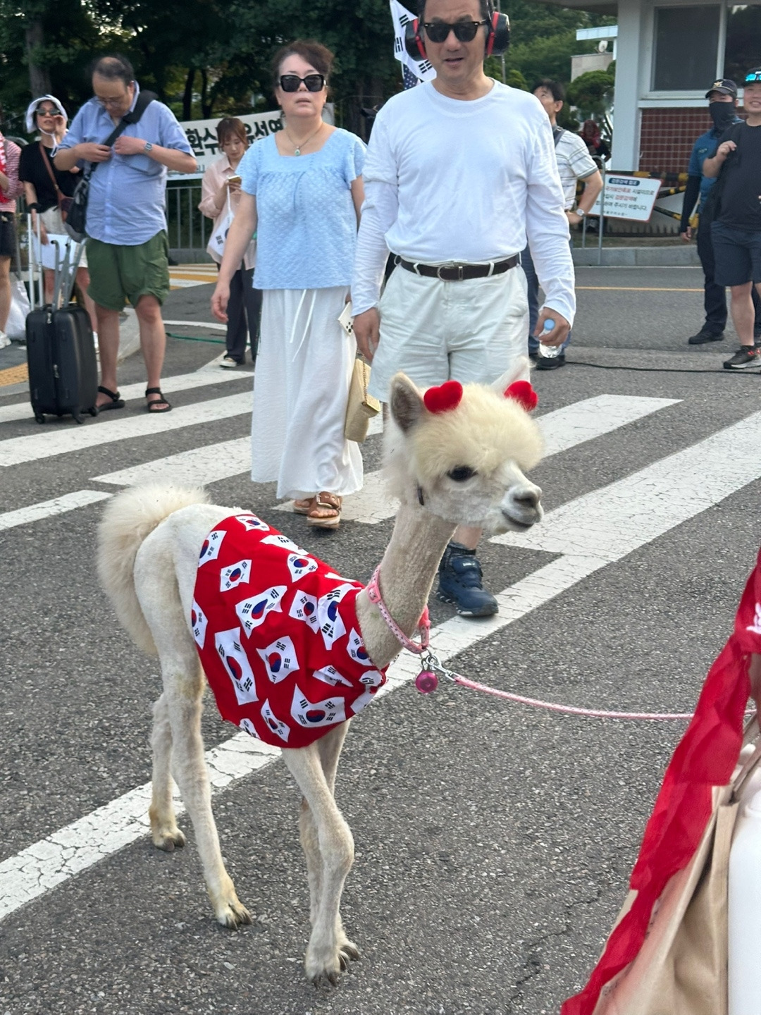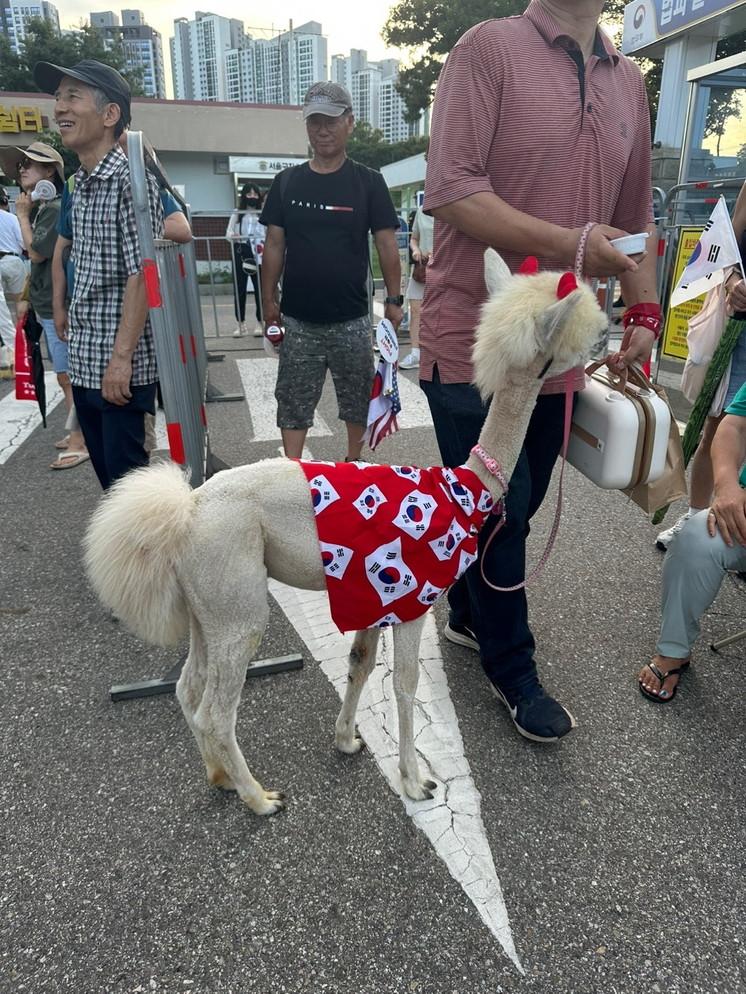 오늘도 햇빛이 매우 뜨거웠다. 가슴골 사이로 땀이 흐른다. 폭염으로 힘겨워하는 사람들에 비해 하늘은 매우 청렴하고 파랗다. 구치소 입구에 들어서자 생각보다 너무나도 많은 애국자분들이 자리를 채워주고 계셨다. 입구 바깥까지 인산인해를 이루었다. 자주 보던 애국 알파카 친구가 지나간다. 오늘은 새로운 태극기 옷을 입고 있다. 가까이 가서 만져보고 싶지만 콘이가 짖을게 뻔하기에 멀리서만 지켜본다. 아기야 안녕. 다음에는 꼭 같이 사진을 찍어야지.