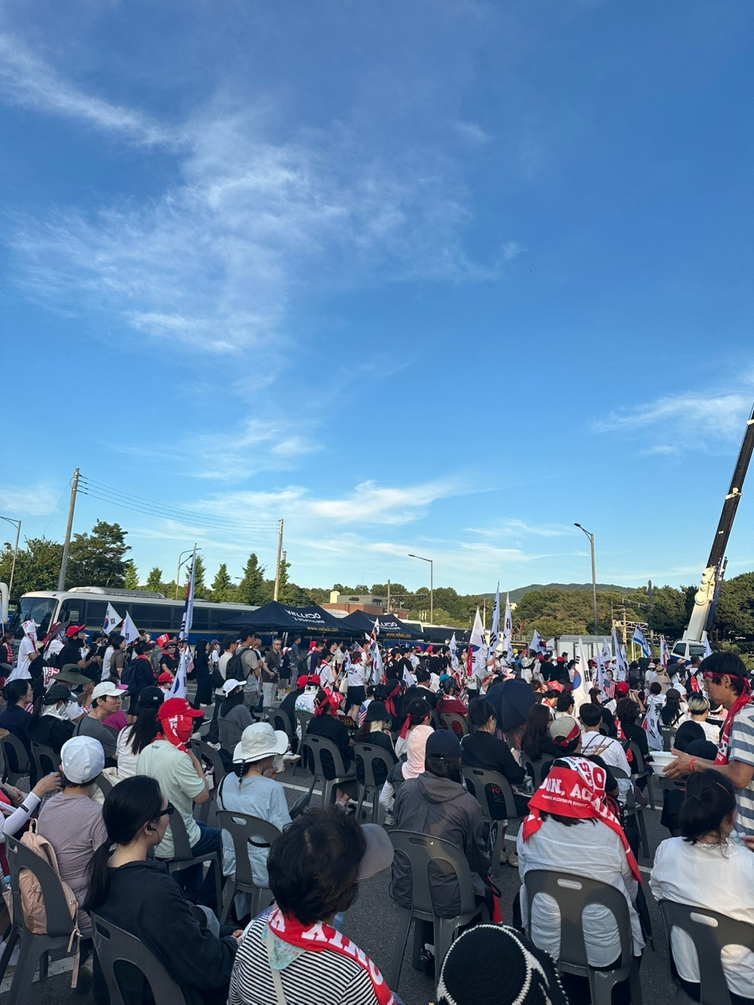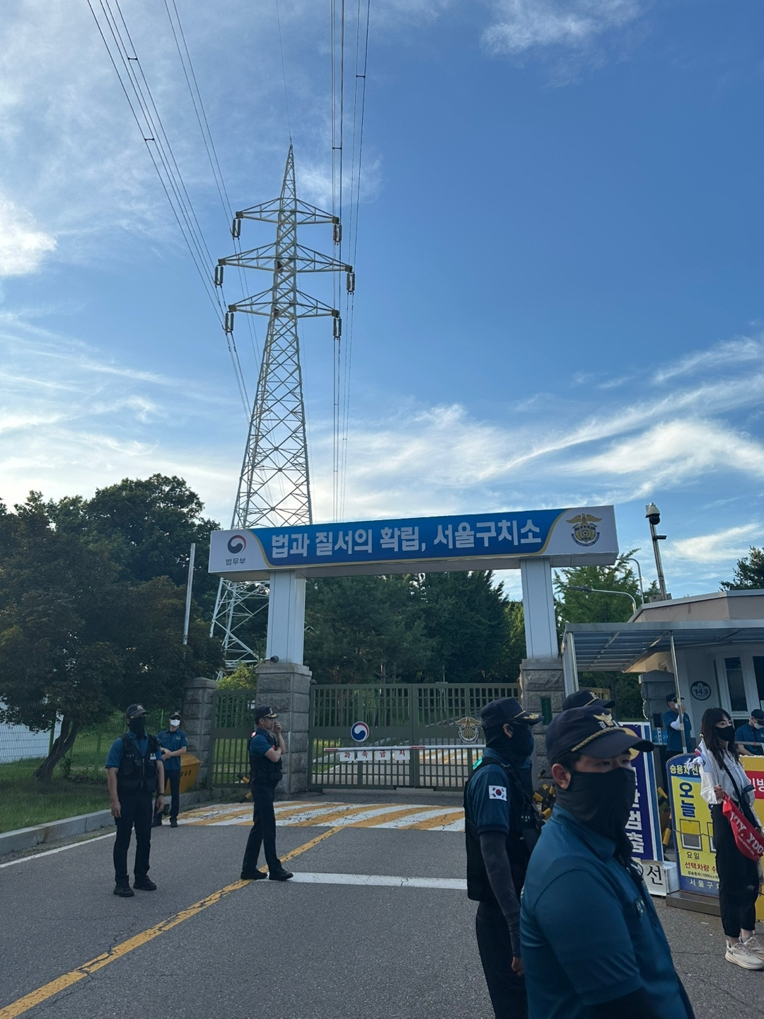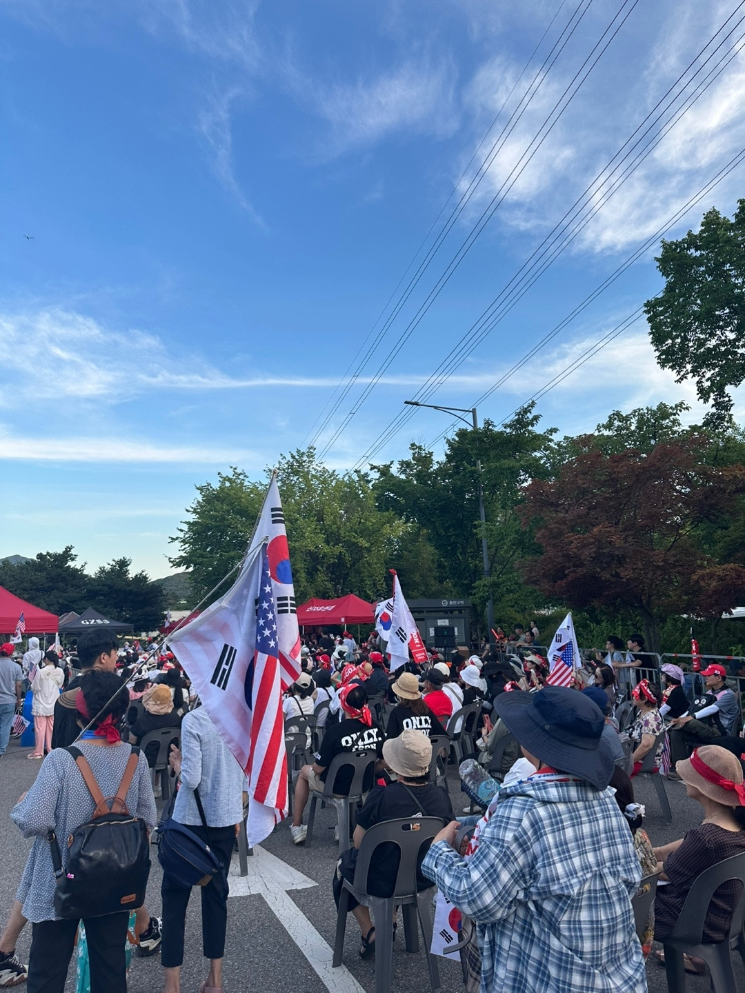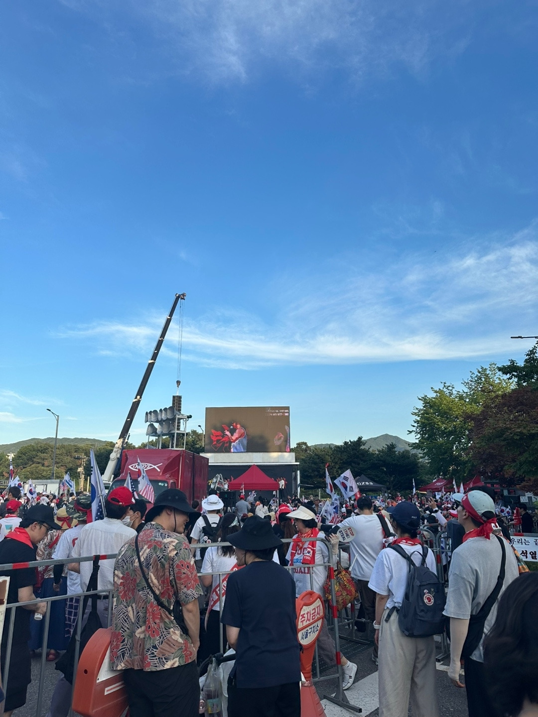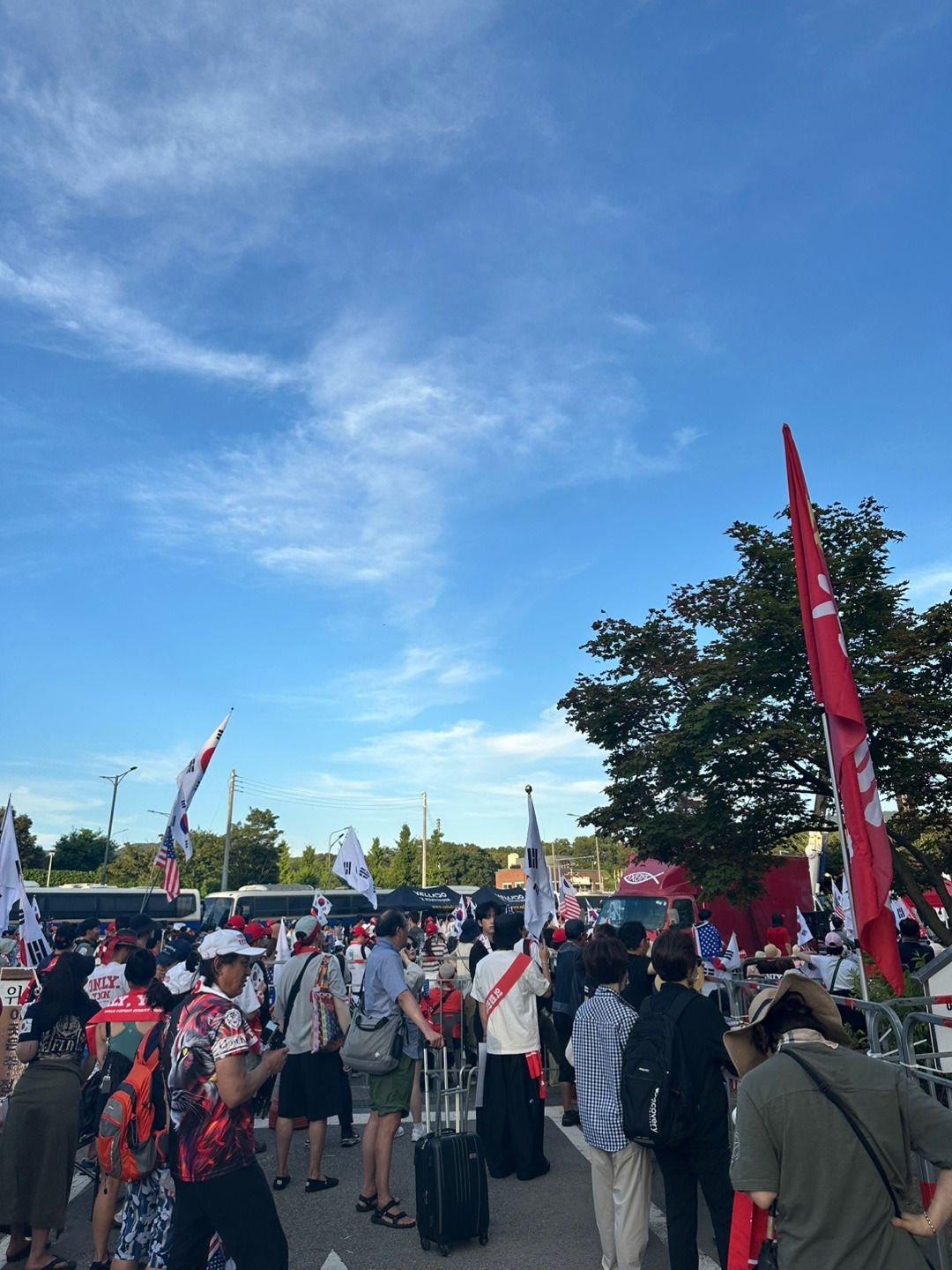 오늘도 햇빛이 매우 뜨거웠다. 가슴골 사이로 땀이 흐른다. 폭염으로 힘겨워하는 사람들에 비해 하늘은 매우 청렴하고 파랗다. 구치소 입구에 들어서자 생각보다 너무나도 많은 애국자분들이 자리를 채워주고 계셨다. 입구 바깥까지 인산인해를 이루었다. 자주 보던 애국 알파카 친구가 지나간다. 오늘은 새로운 태극기 옷을 입고 있다. 가까이 가서 만져보고 싶지만 콘이가 짖을게 뻔하기에 멀리서만 지켜본다. 아기야 안녕. 다음에는 꼭 같이 사진을 찍어야지.