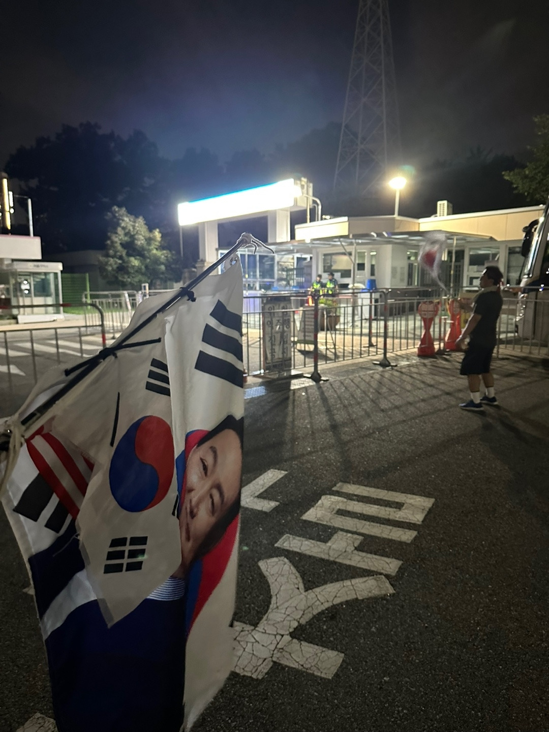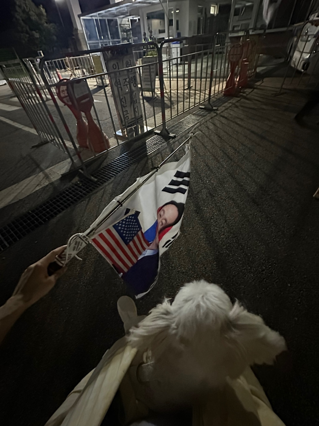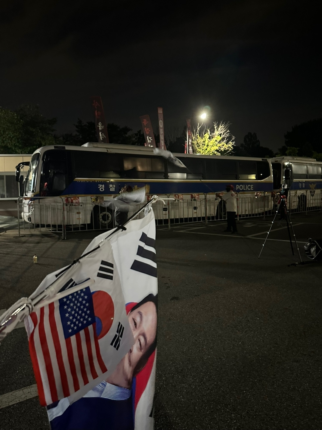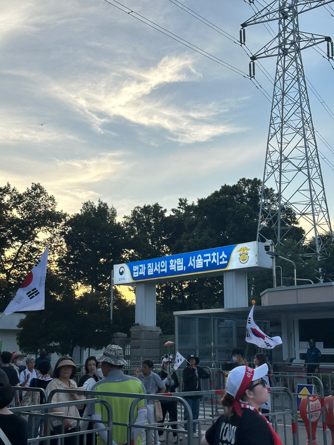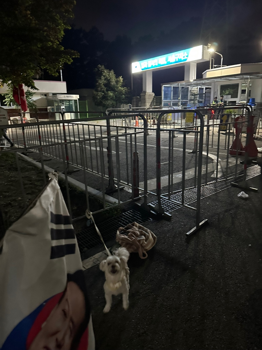 구치소 입구를 지나치려고 하는데 청년들이 태극기를 흔들며 다시 구호를 외친다. 차마 발길이 떨어지지 않는다. 그래 이왕 늦은 거 더 있다 가자. 나는 가방을 내려놓고 콘이를 잠시 묶어놓고 힘차게 태극기를 크게 흔든다. 좌우로 더 크게 젓는다. 나의 기운이, 우리의 기운이 제발 윤 대통령님께 닿기를. 우리의 기운을 다 느끼고 계시겠지. 파란 구치소 간판 불빛이 유난히 밝아 보인다.